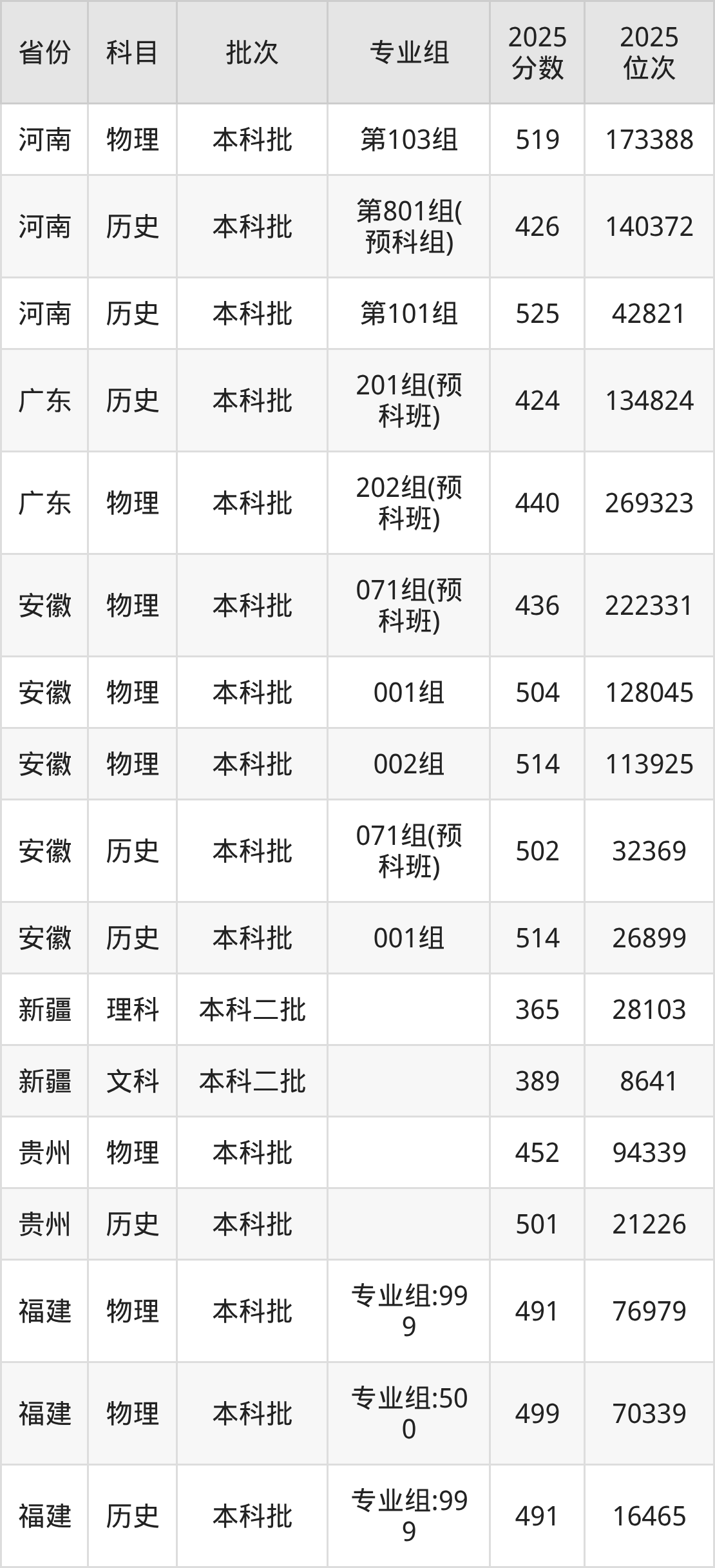 2025年福建商学院全国录取分数线是305分到550分,录取最低在吉林物理类(第001组)、录取最高在贵州历史类。各省各专业组最低分具有差异,详情如下: