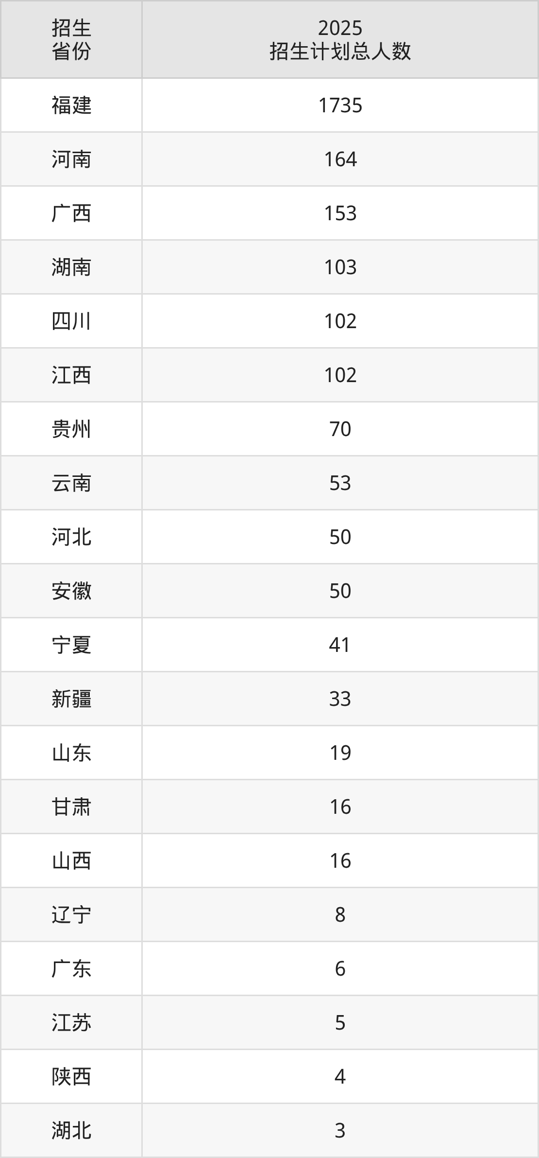 2025年福建商学院面向全国25个省市开展本科招生;招生专业共39个,招生人数共2740人。2025年在福建省招生计划总人数是1735人,其中,福建商学院在福建省招生人数最多的是数据科学与大数据技术。福建商学院在各省具体招生人数情况如下表。