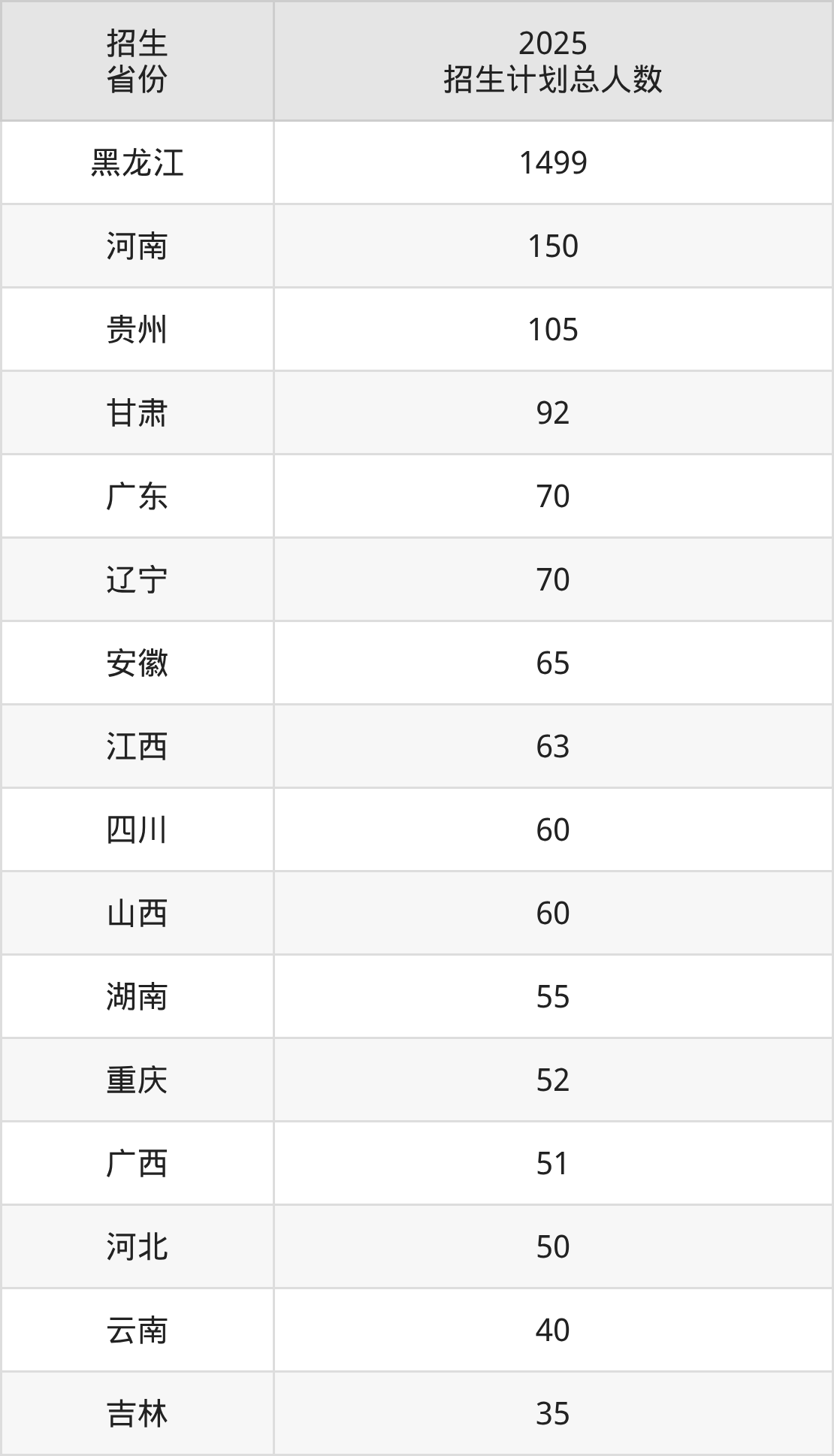 2025年黑龙江工程学院面向全国26个省市开展本科招生;招生专业共35个,招生人数共2729人。2025年在黑龙江省招生计划总人数是1499人,其中,黑龙江工程学院在黑龙江省招生人数最多的是能源与动力工程。黑龙江工程学院在各省具体招生人数情况如下表。
