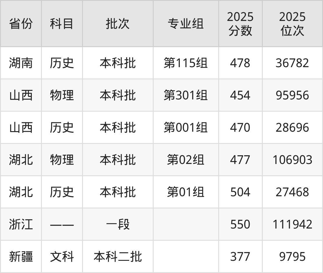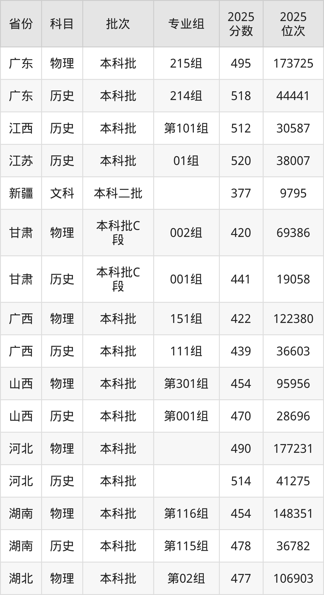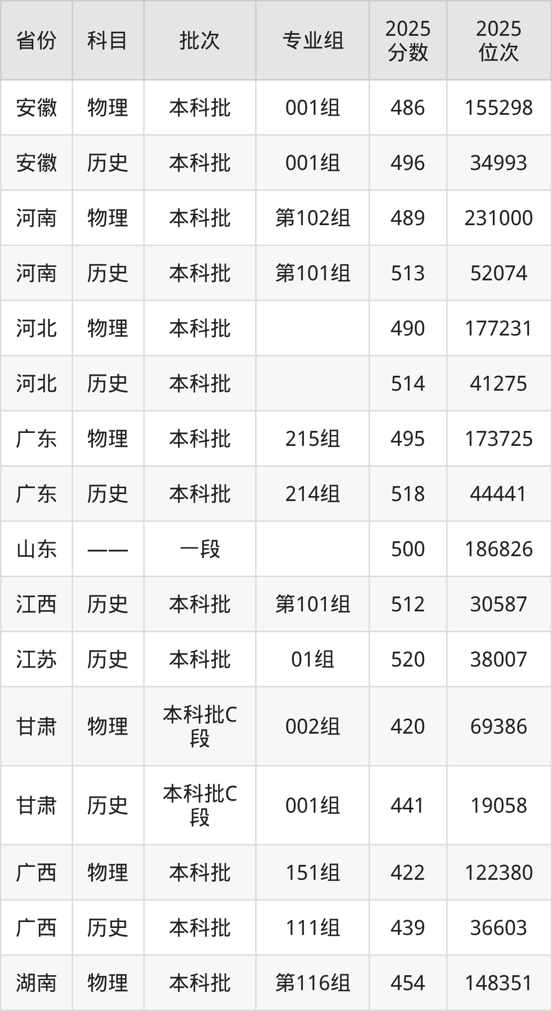 2025年在本科历史类进行招生,各专业组分数线详情如下:
