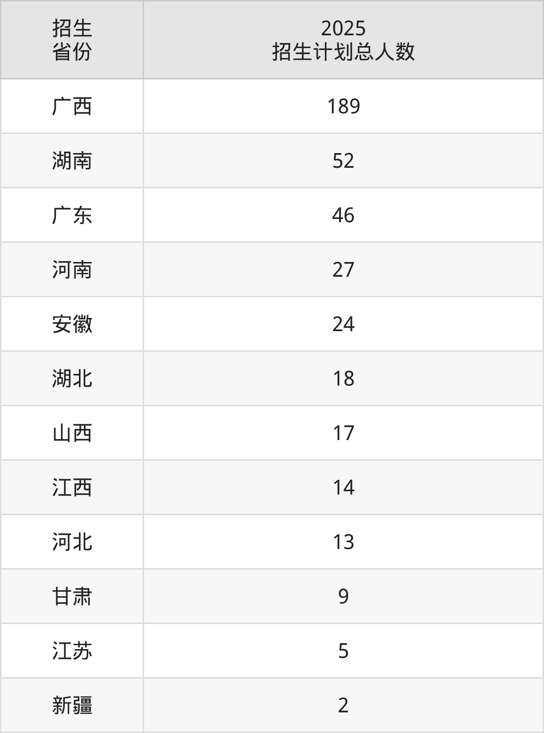 2025年广西艺术学院面向全国12个省市开展本科招生;招生专业共10个,招生人数共416人。2025年在广西壮族自治区招生计划总人数是189人,其中,广西艺术学院在广西壮族自治区招生人数最多的是艺术与科技。广西艺术学院在各省具体招生人数情况如下表。