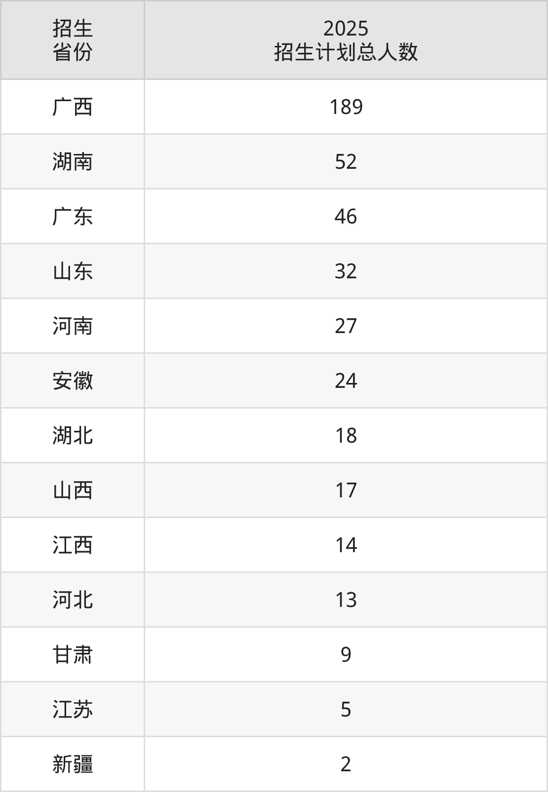 2025年广西艺术学院面向全国13个省市开展本科招生;招生专业共10个,招生人数共448人。2025年在广西壮族自治区招生计划总人数是189人,其中,广西艺术学院在广西壮族自治区招生人数最多的是艺术与科技。广西艺术学院在各省具体招生人数情况如下表。