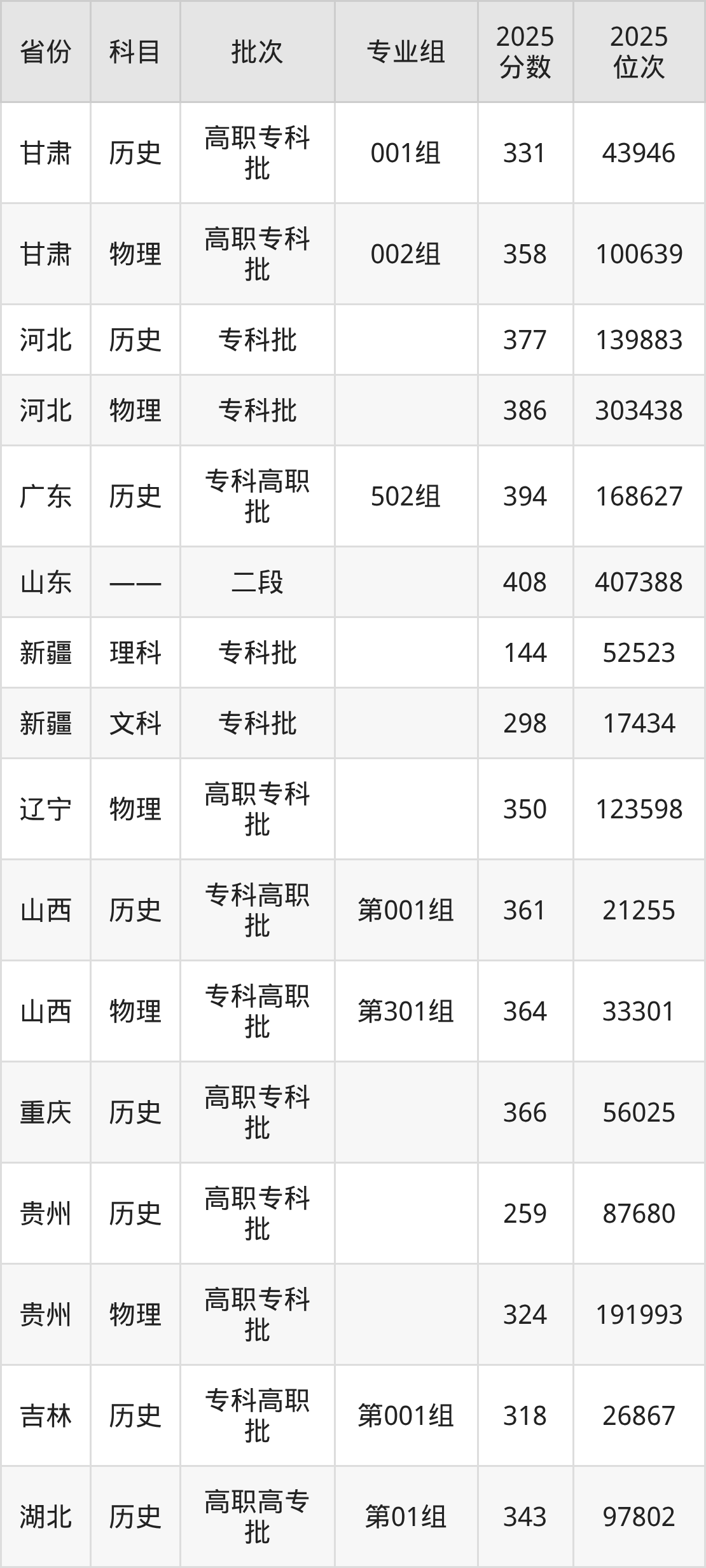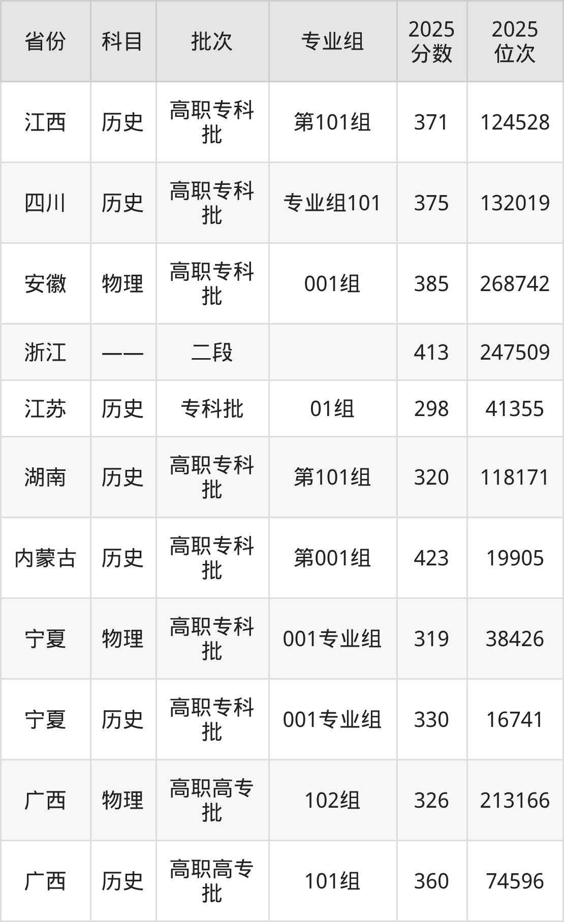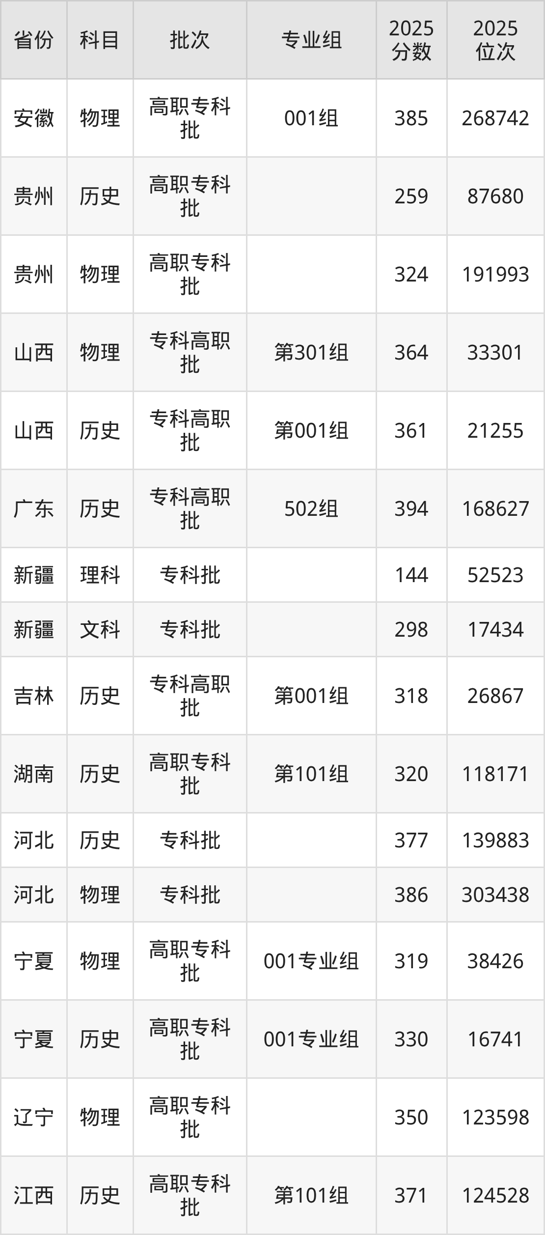 2025年在专科物理类进行招生,各专业组分数线详情如下: