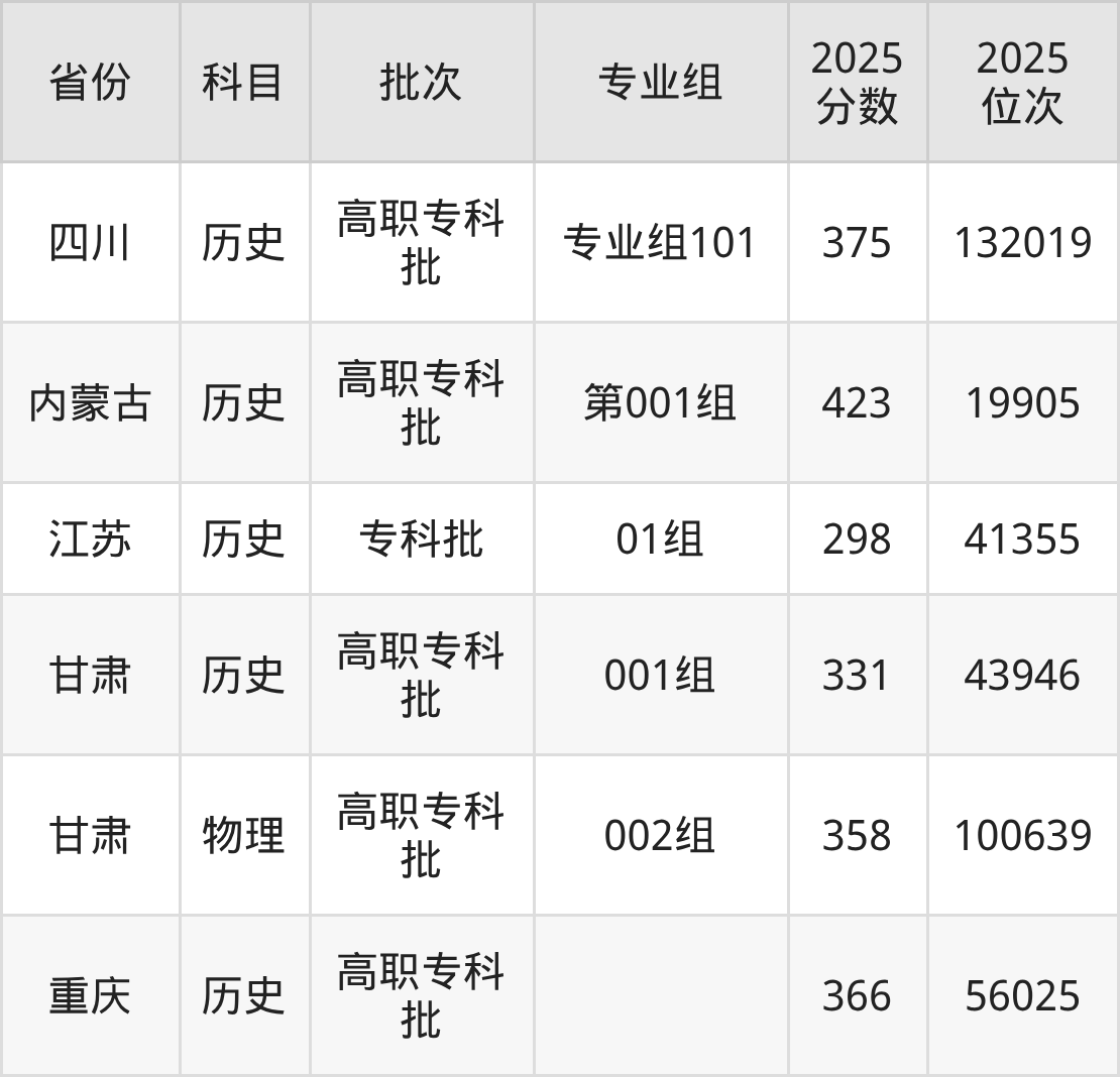 2025年在专科历史类进行招生,各专业组分数线详情如下: