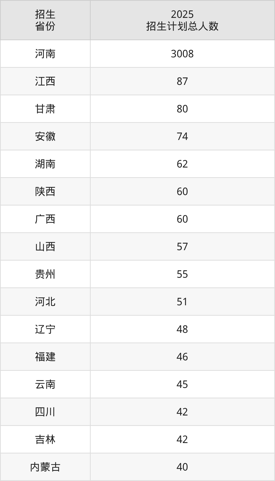 2025年洛阳师范学院面向全国26个省市开展本科招生;招生专业共48个,招生人数共4117人。2025年在河南省招生计划总人数是3008人,其中,洛阳师范学院在河南省招生人数最多的是数学与应用数学。洛阳师范学院在各省具体招生人数情况如下表。