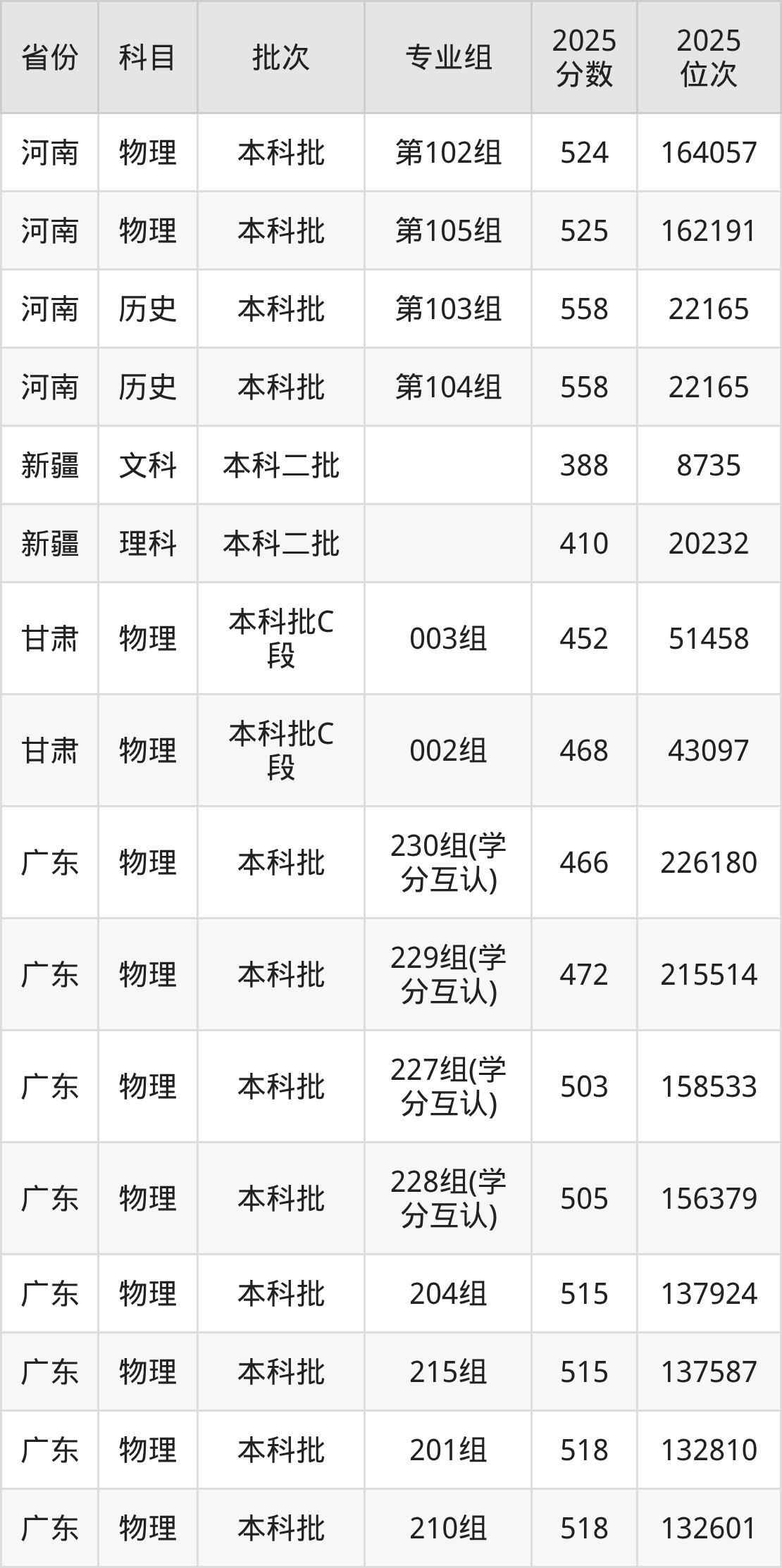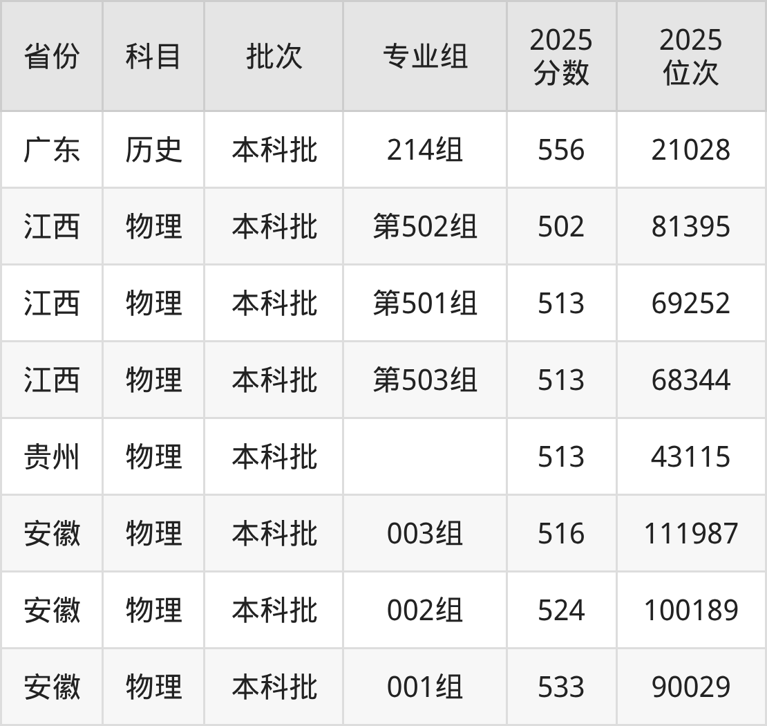 2025年在本科物理类进行招生,各专业组分数线详情如下: