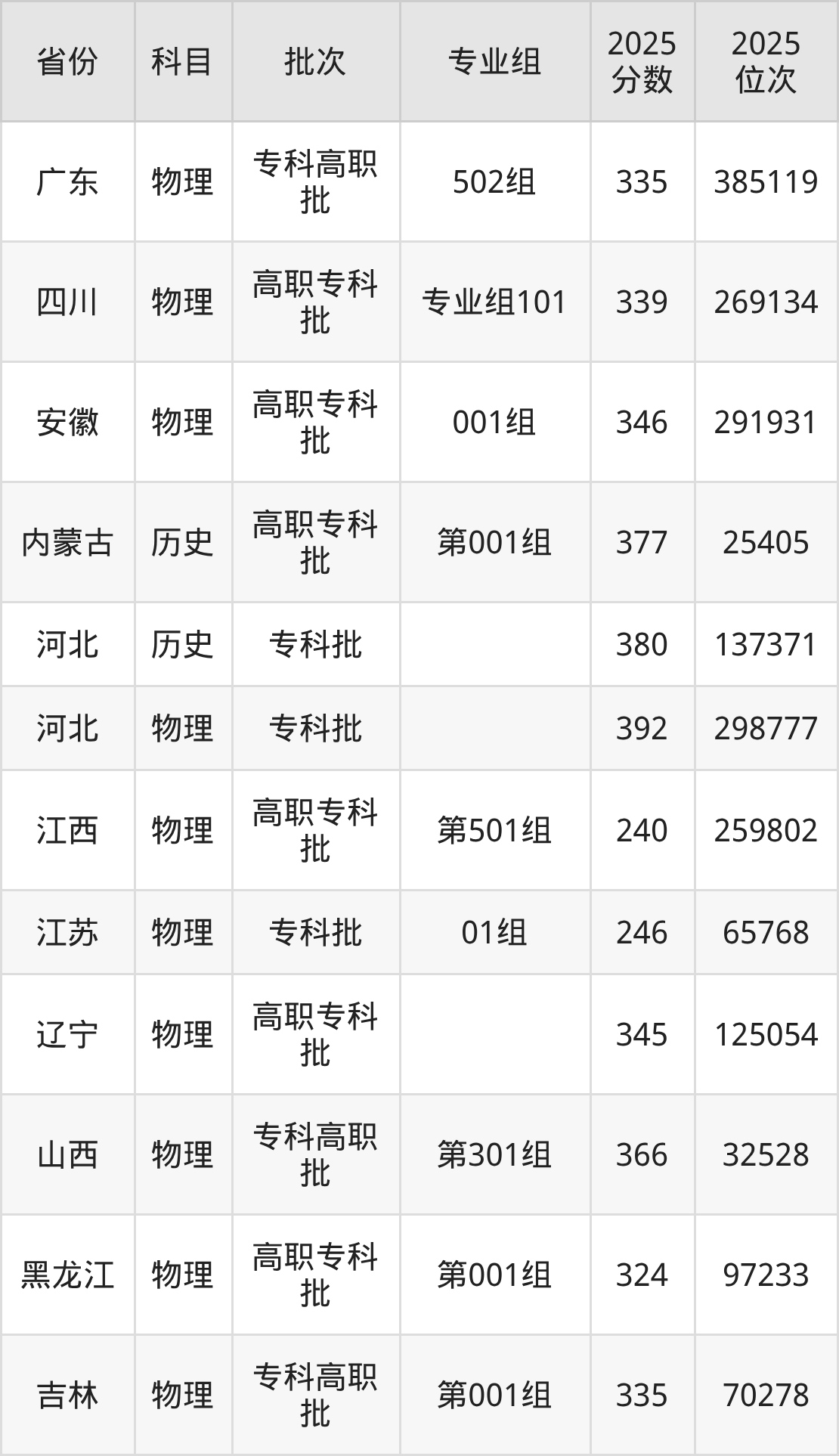 2025年在专科物理类进行招生,各专业组分数线详情如下: