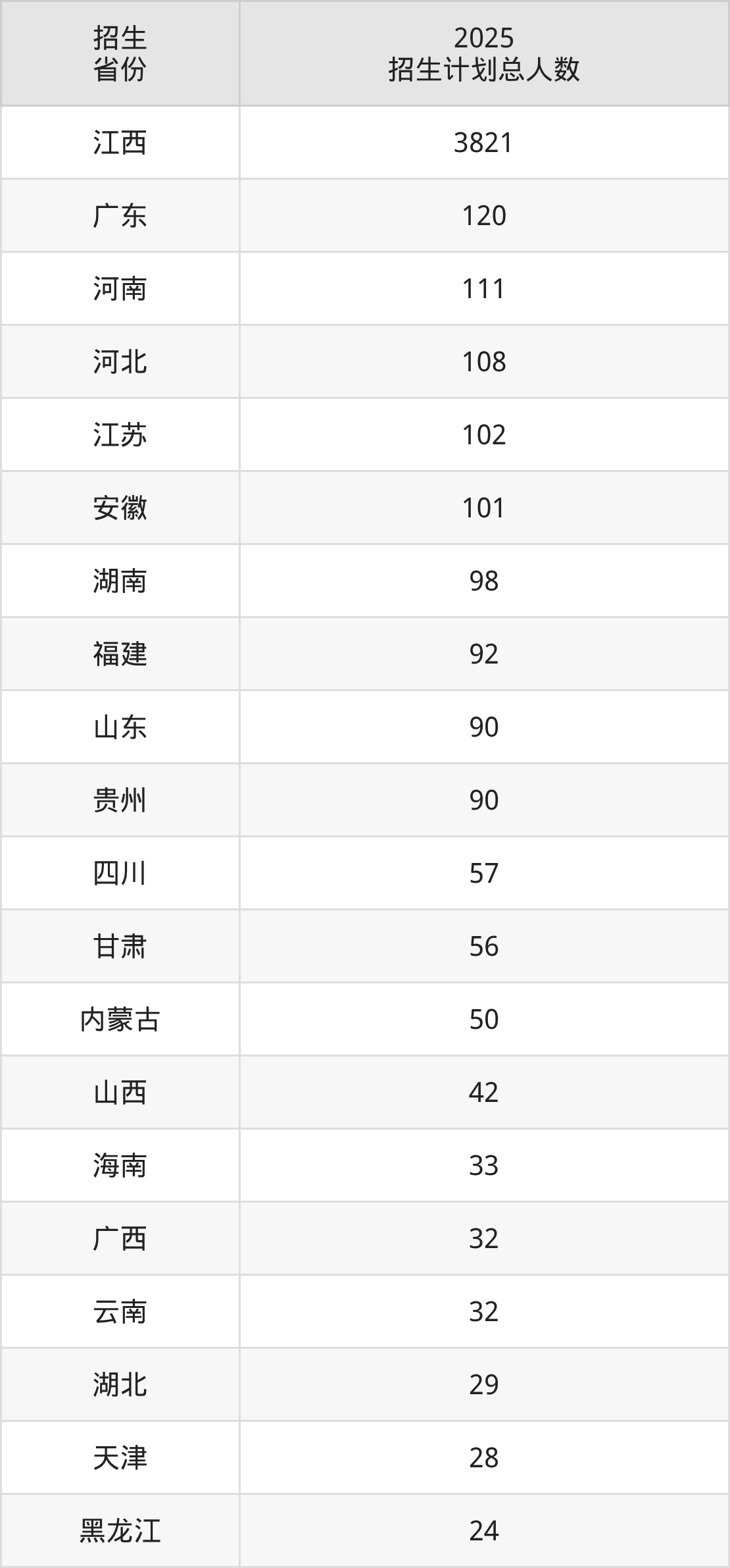 2025年赣南师范大学面向全国26个省市开展本科招生;招生专业共46个,招生人数共5200人。2025年在江西省招生计划总人数是3821人,其中,赣南师范大学在江西省招生人数最多的是复合材料成型工程。赣南师范大学在各省具体招生人数情况如下表。