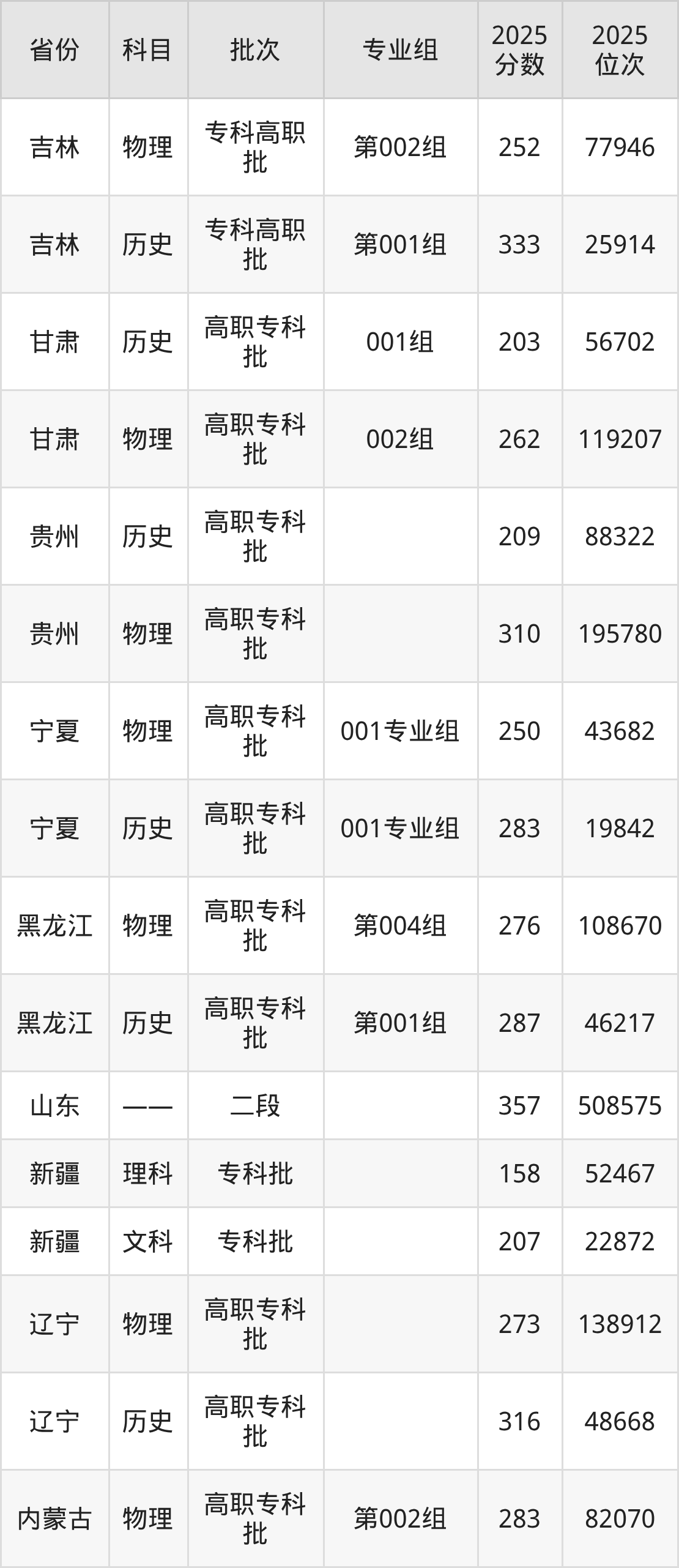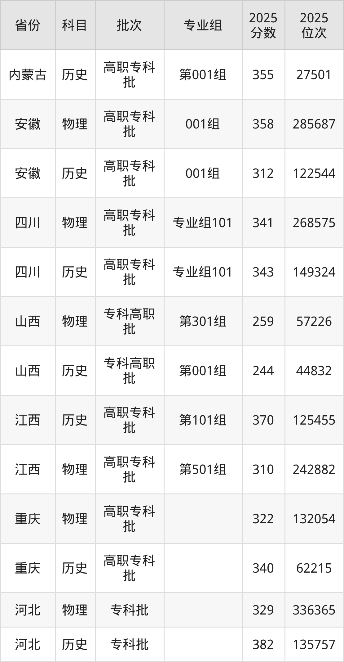 普通类专科物理类最低283分,专科历史类最低355分