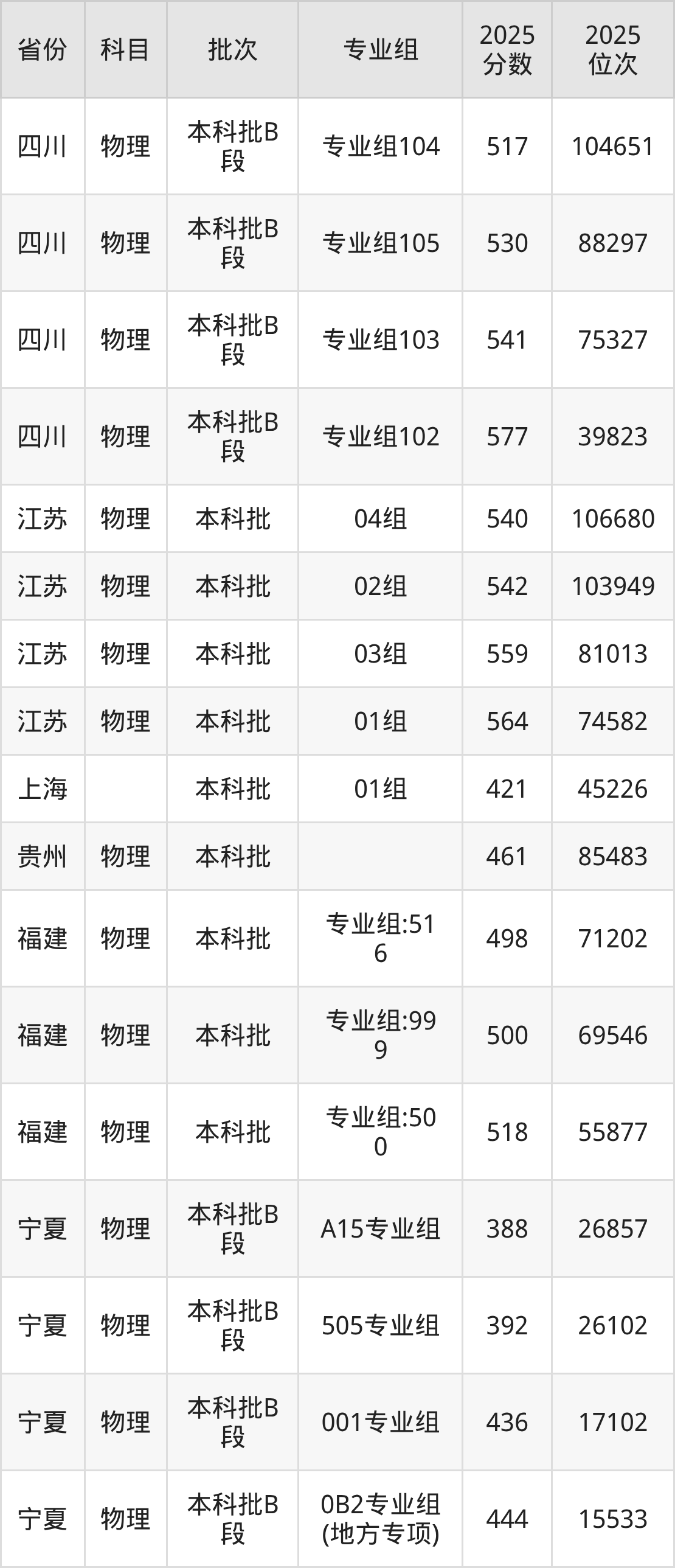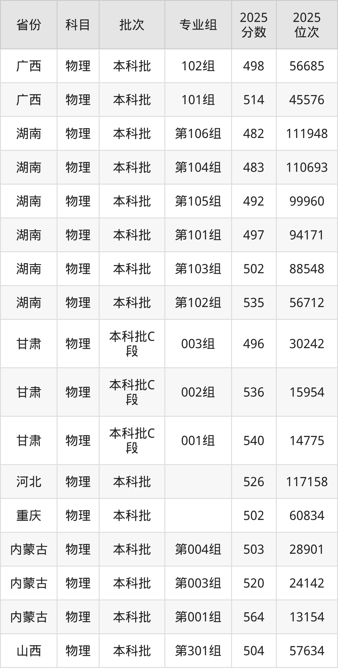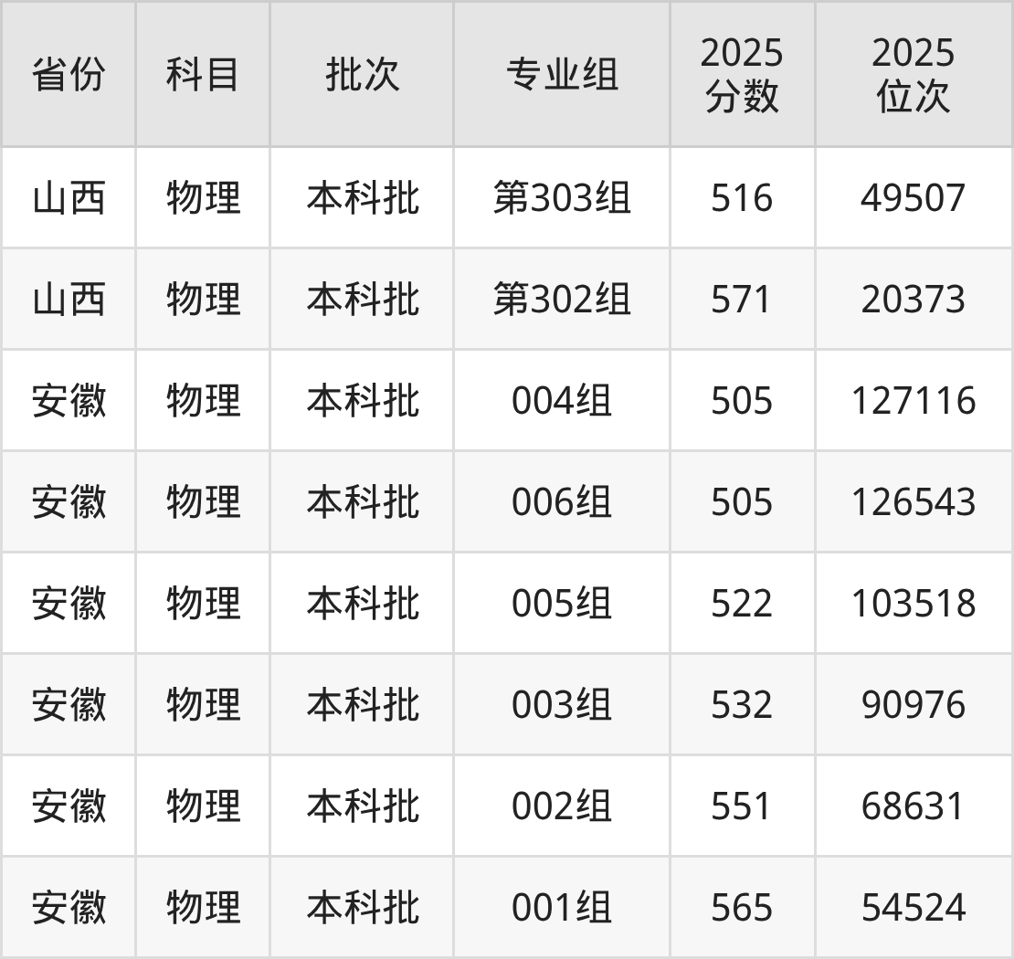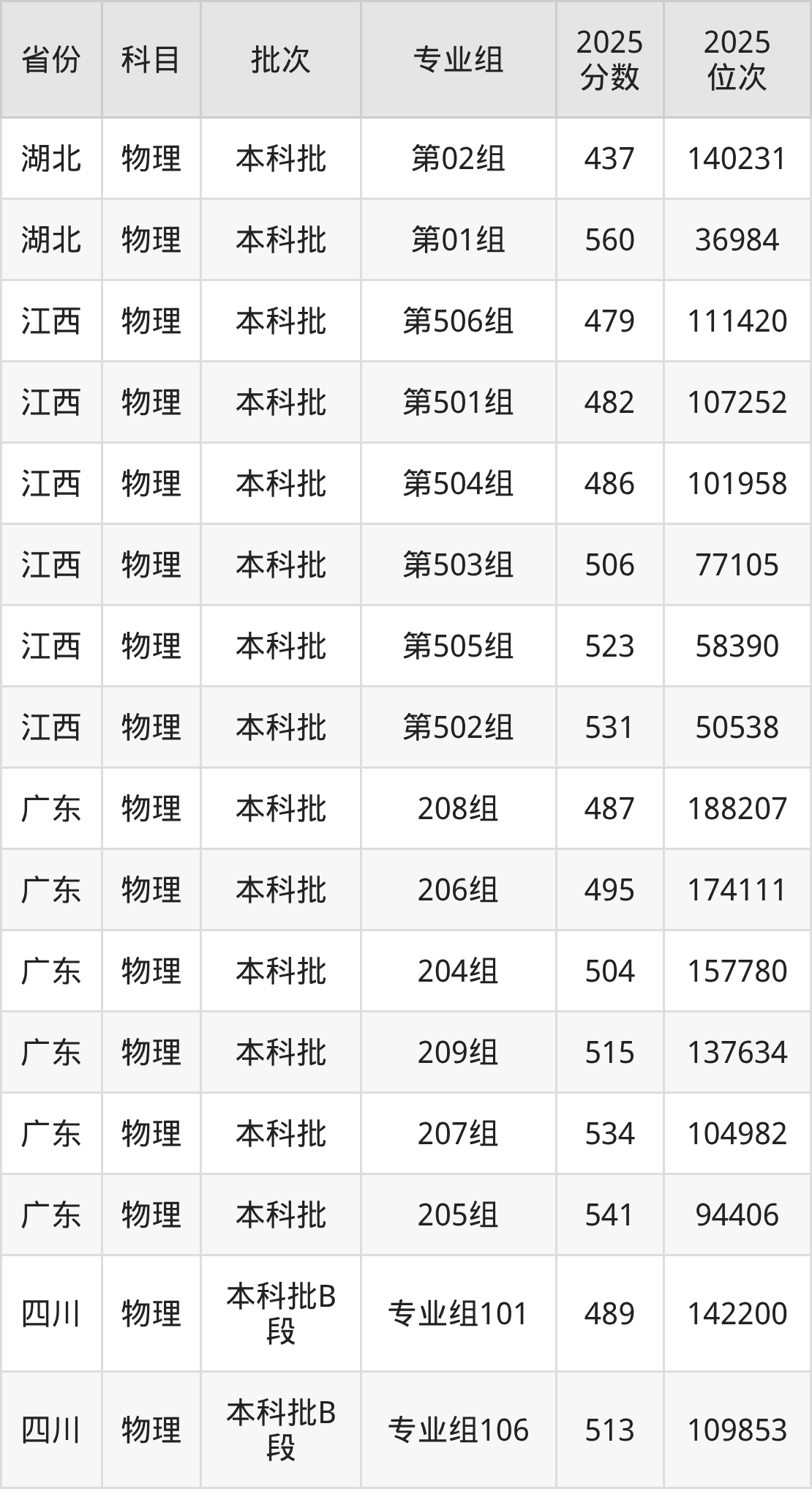 2025年在本科物理类进行招生,各专业组分数线详情如下: