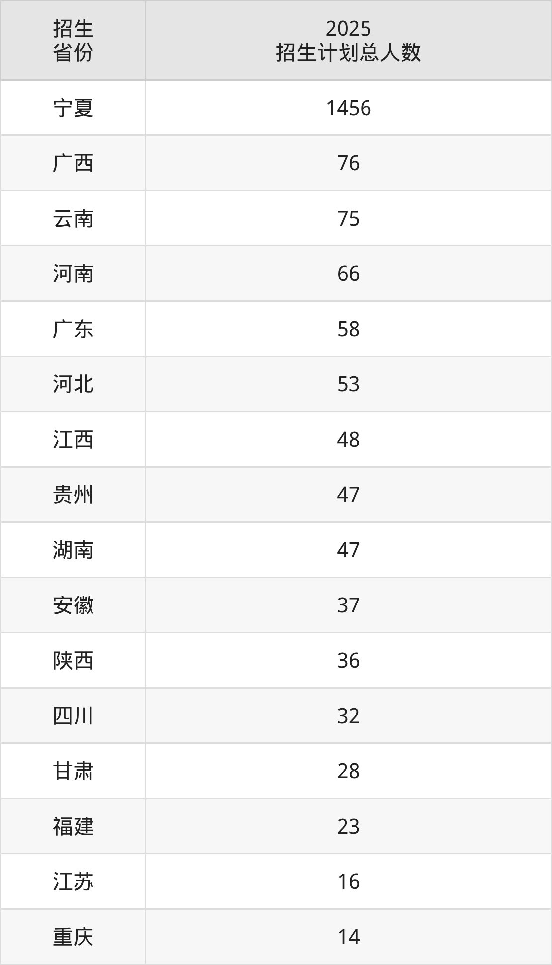 2025年宁夏医科大学面向全国21个省市开展本科招生;招生专业共24个,招生人数共2082人。2025年在宁夏回族自治区招生计划总人数是1456人,其中,宁夏医科大学在宁夏回族自治区招生人数最多的是临床医学。宁夏医科大学在各省具体招生人数情况如下表。