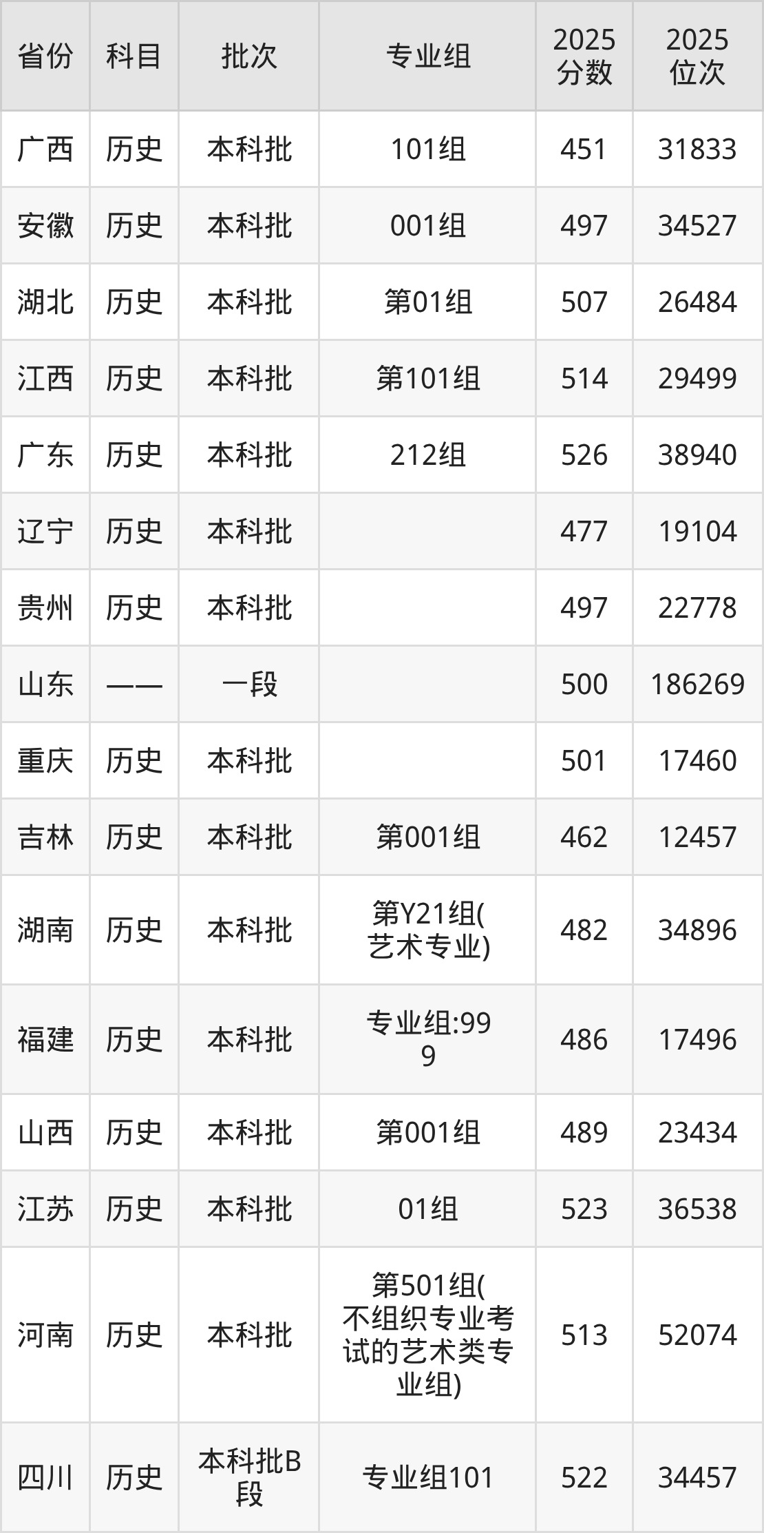 2025年在本科历史类进行招生,各专业组分数线详情如下: