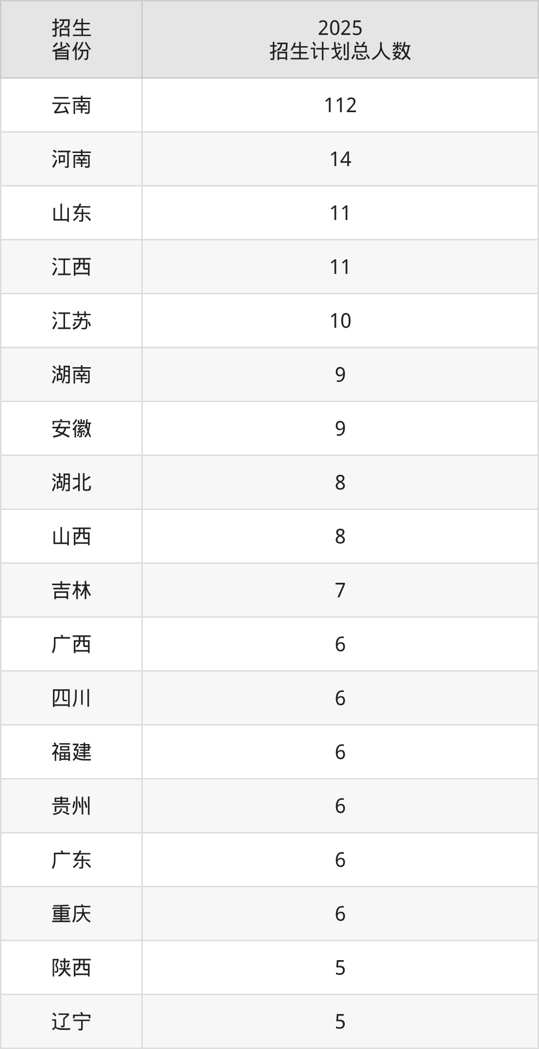 2025年云南艺术学院面向全国18个省市开展本科招生;招生专业共5个,招生人数共245人。2025年在云南省招生计划总人数是112人,其中,云南艺术学院在云南省招生人数最多的是广播电视编导。云南艺术学院在各省具体招生人数情况如下表。