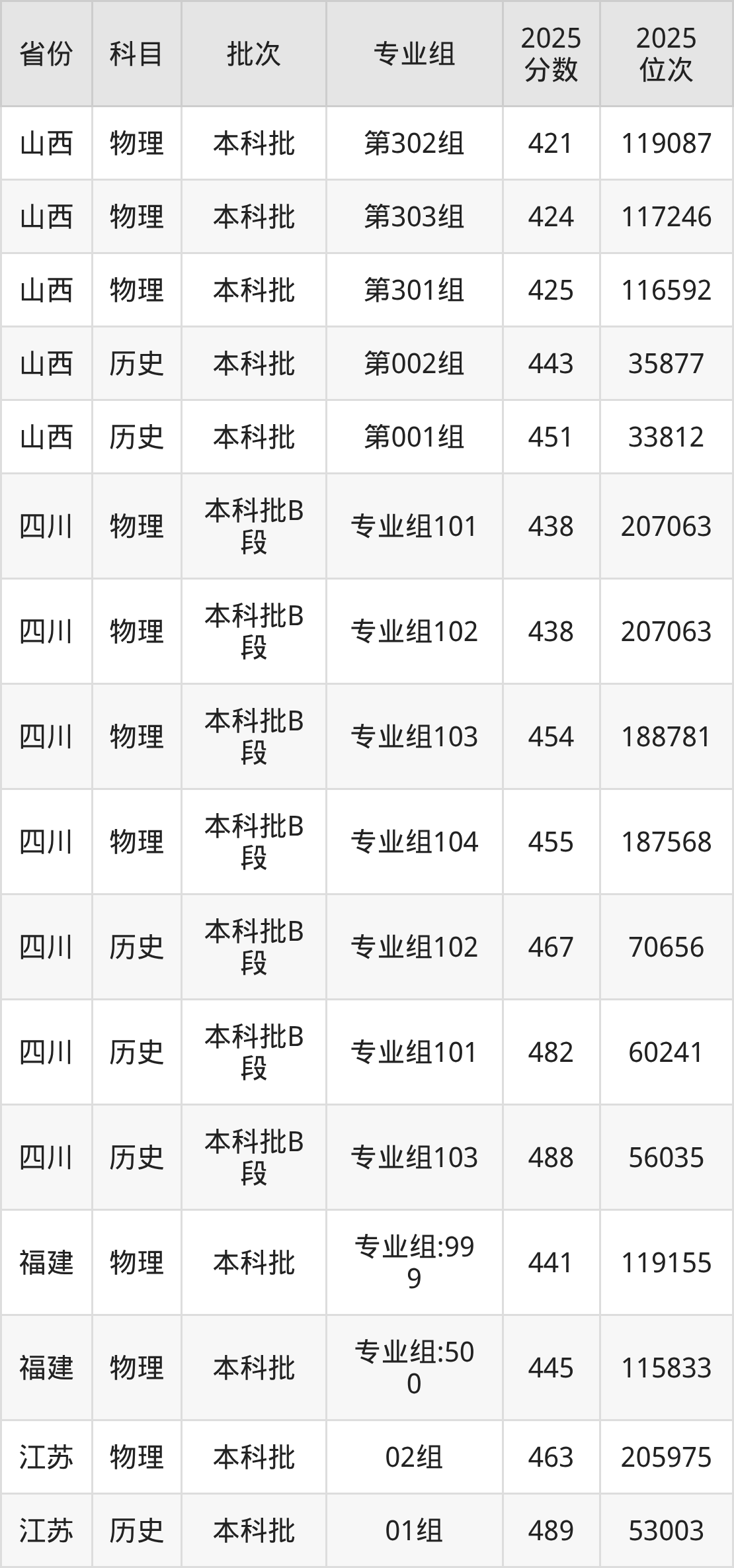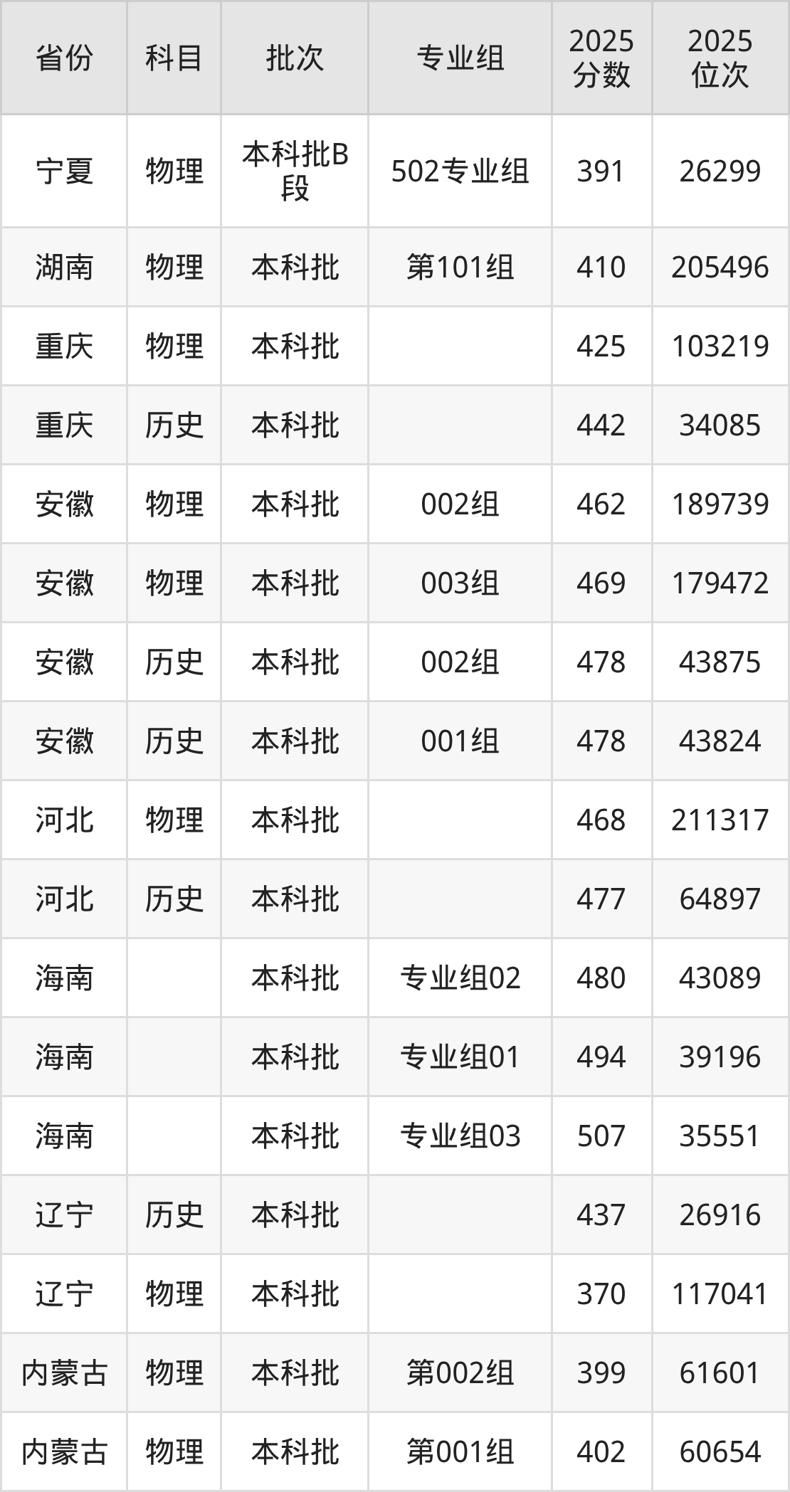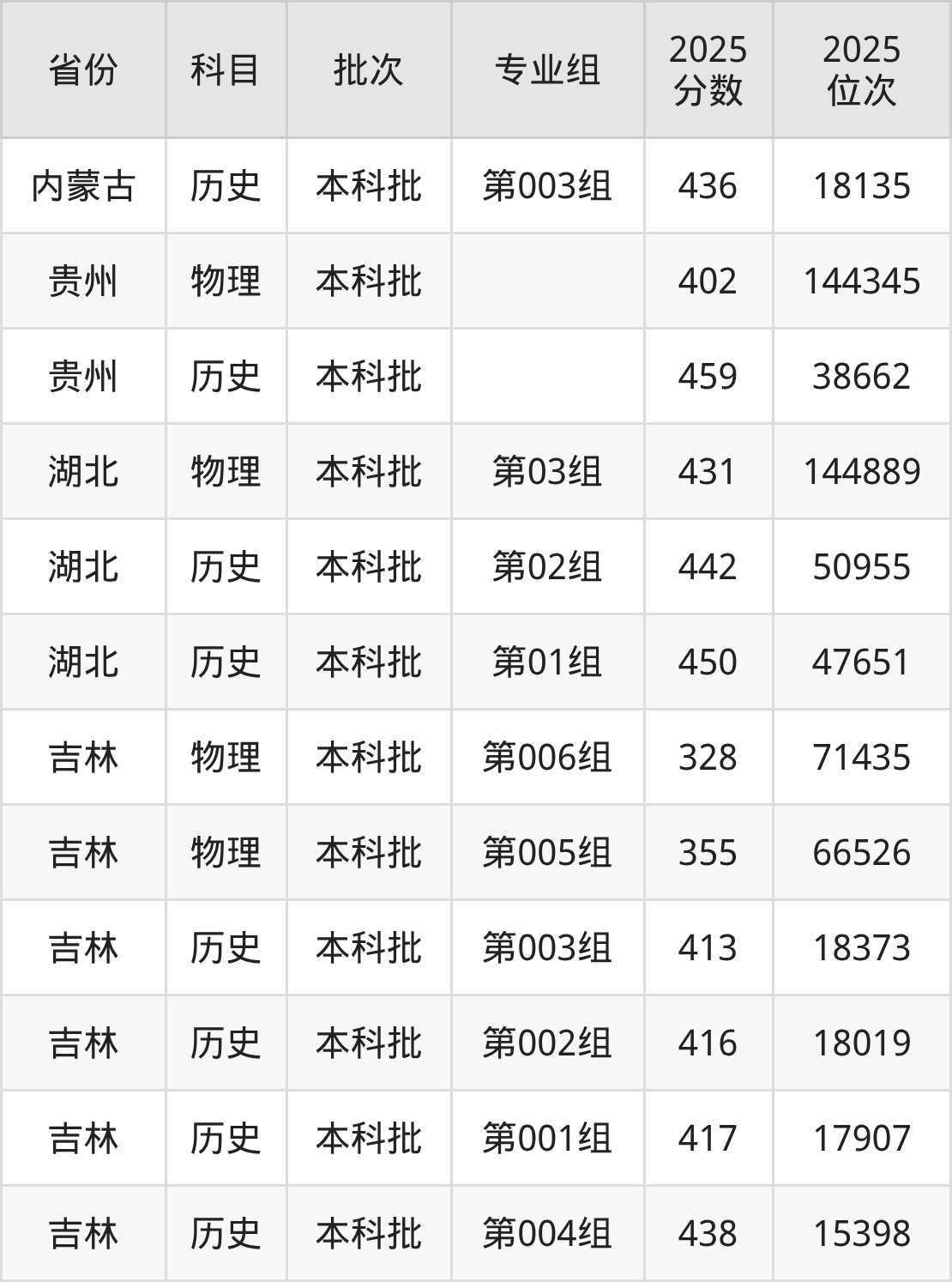 2025年在本科物理类进行招生,各专业组分数线详情如下: