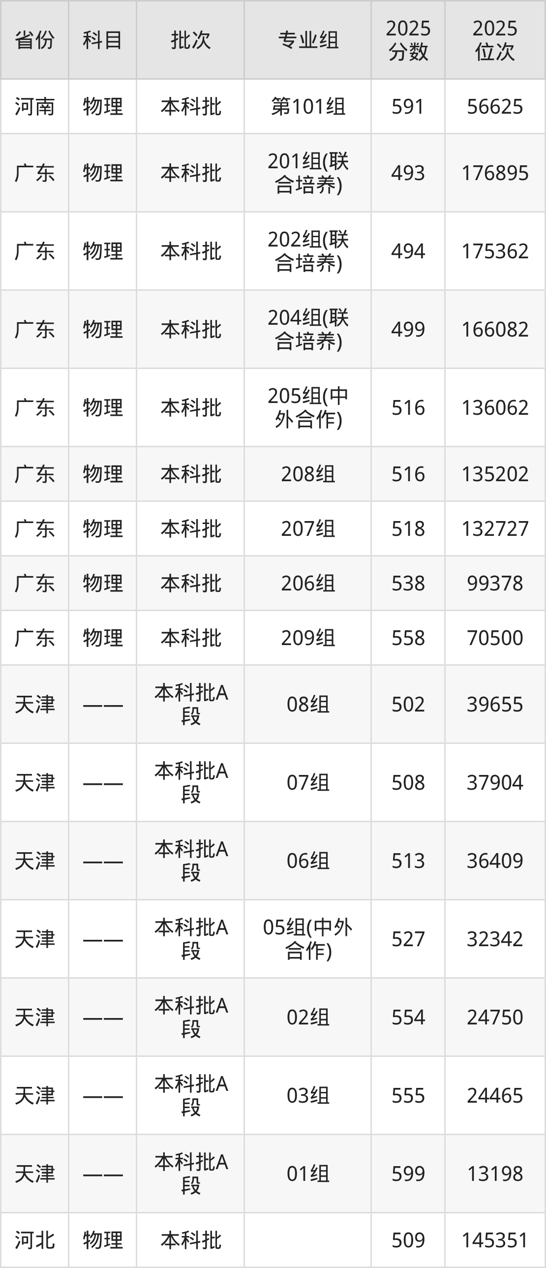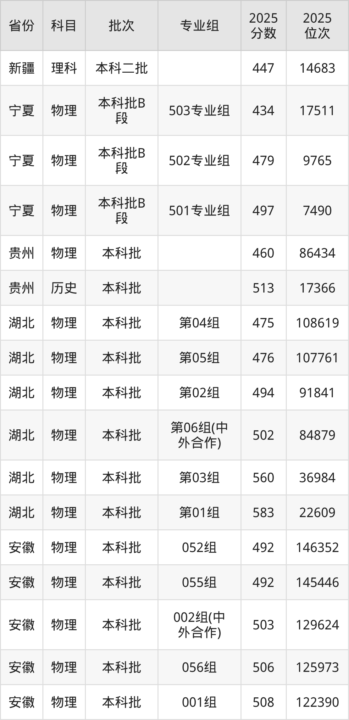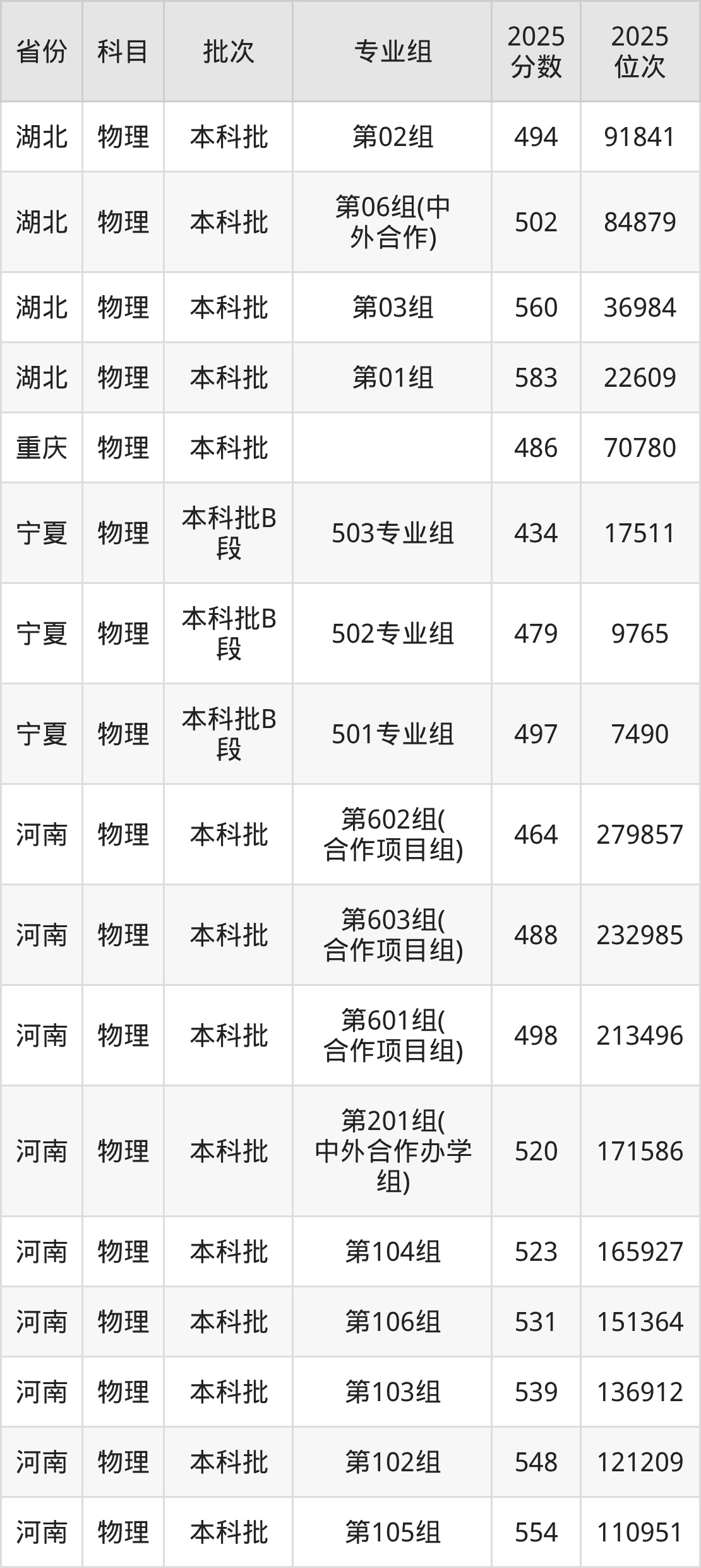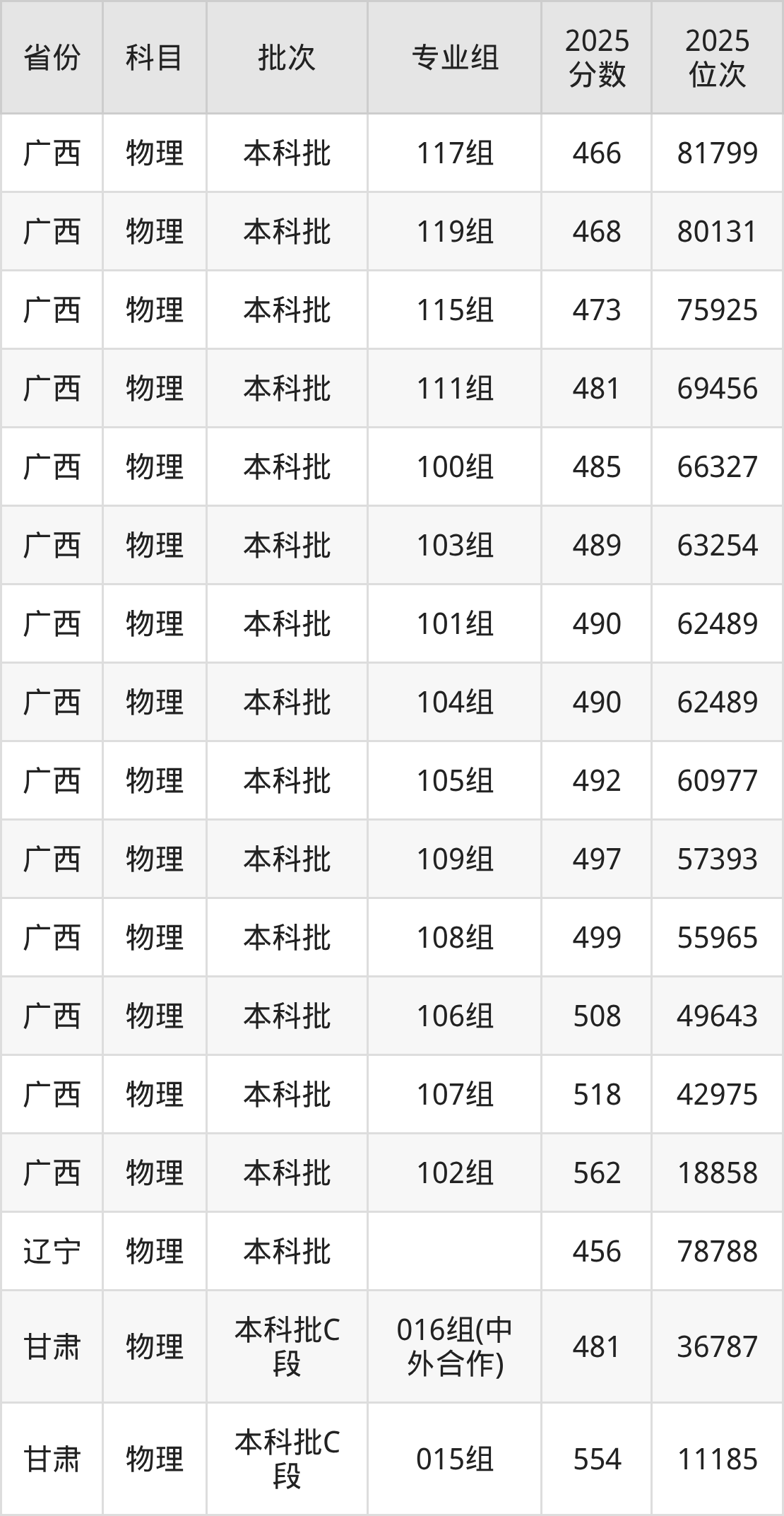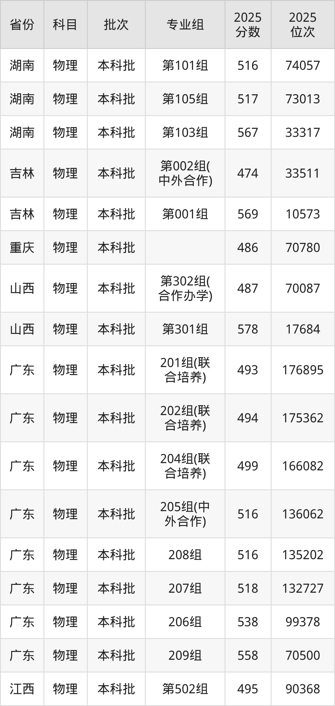 2025年在本科物理类进行招生,各专业组分数线详情如下: