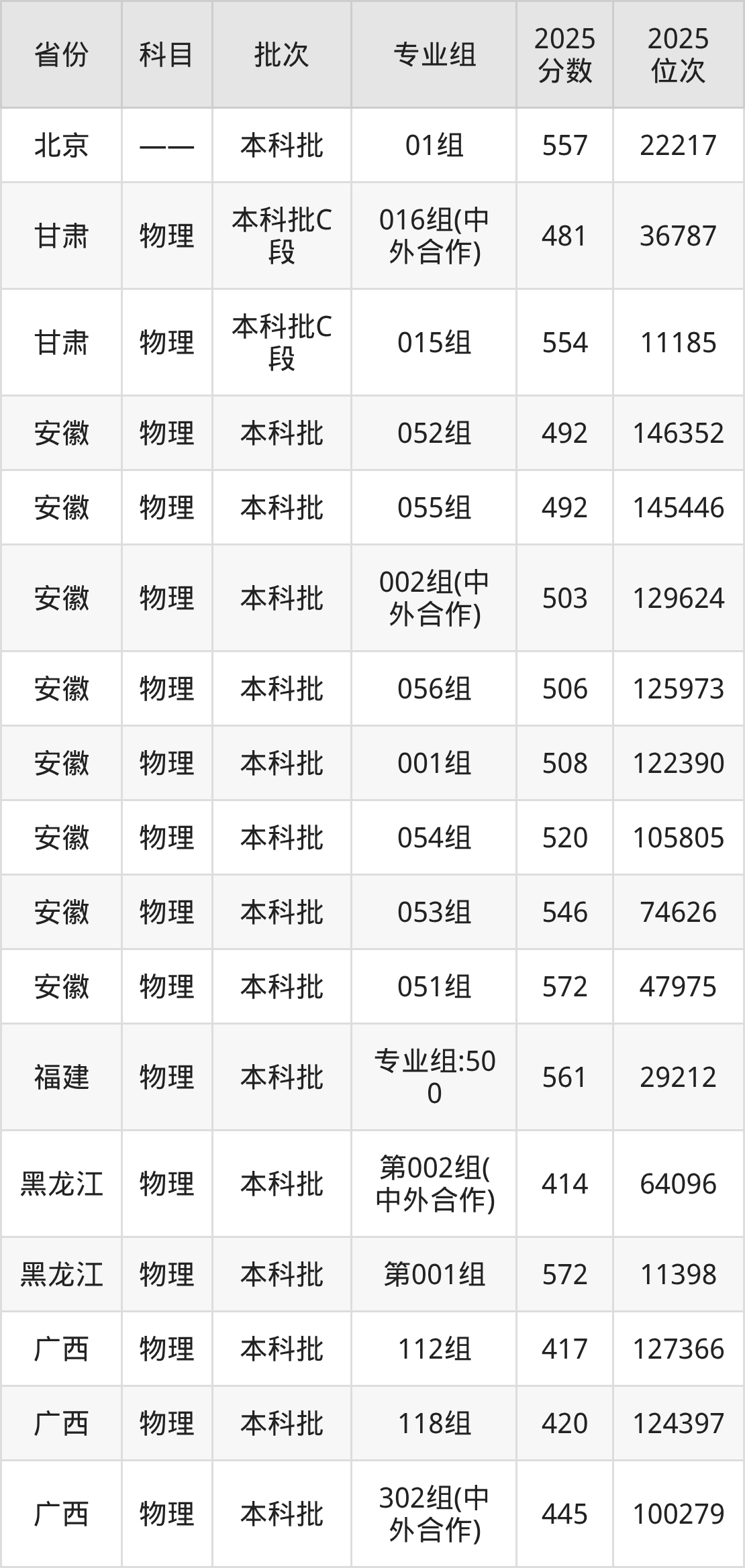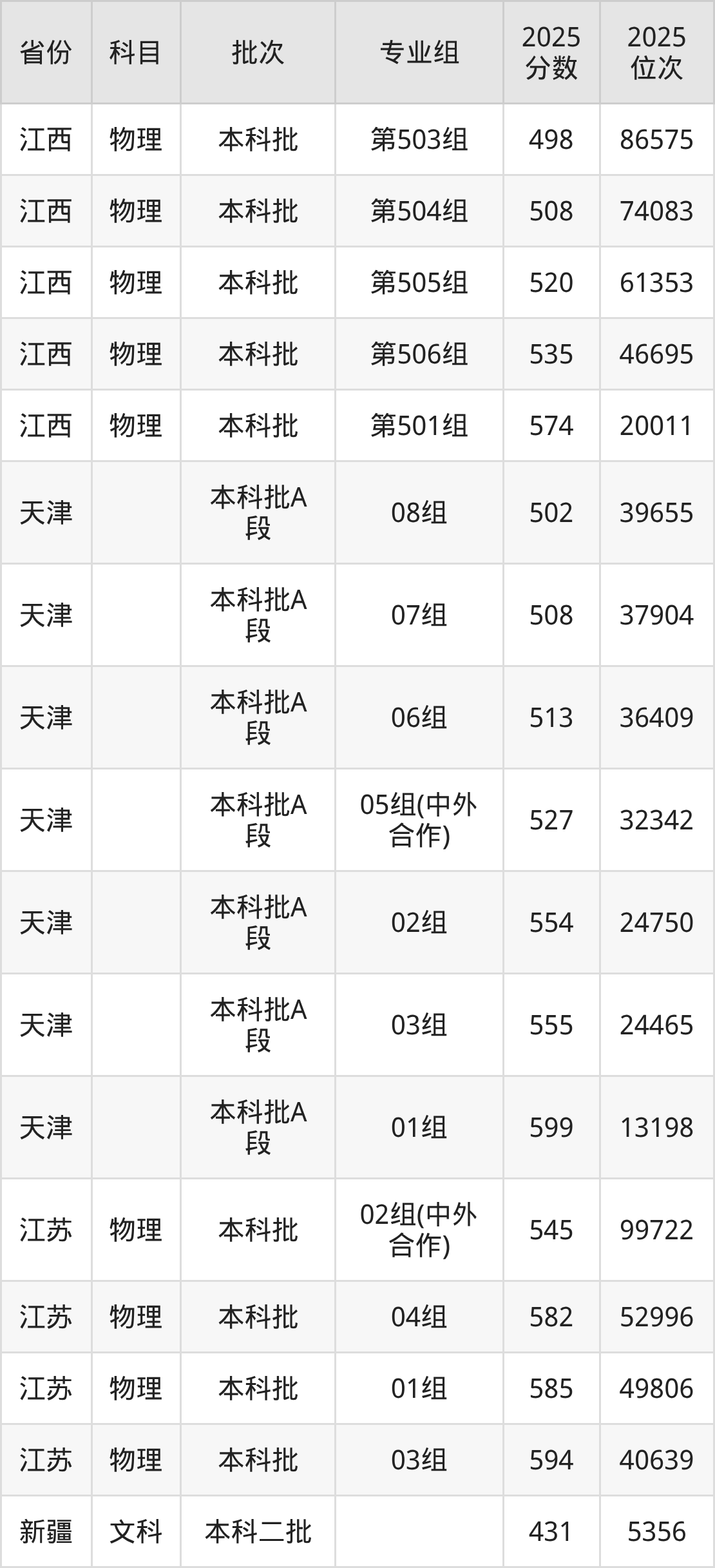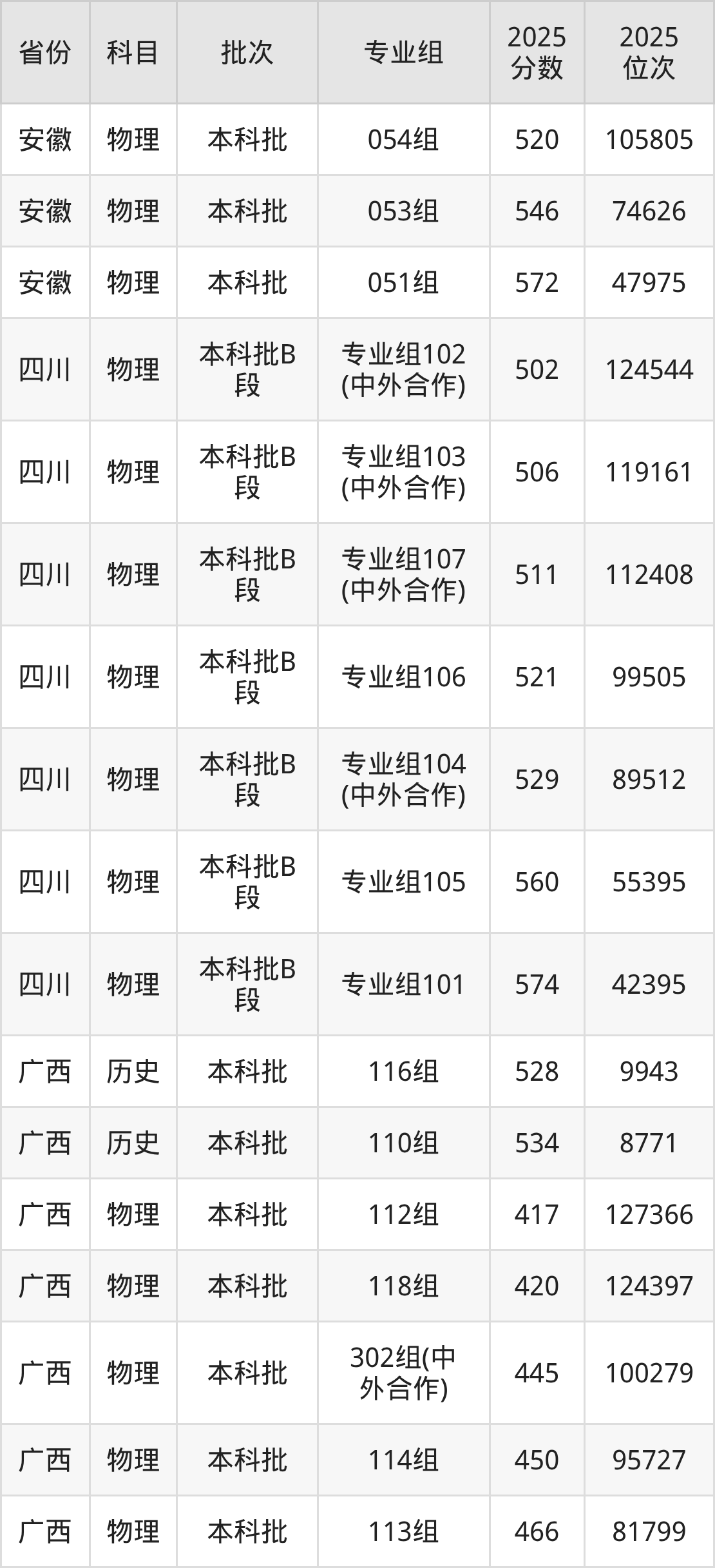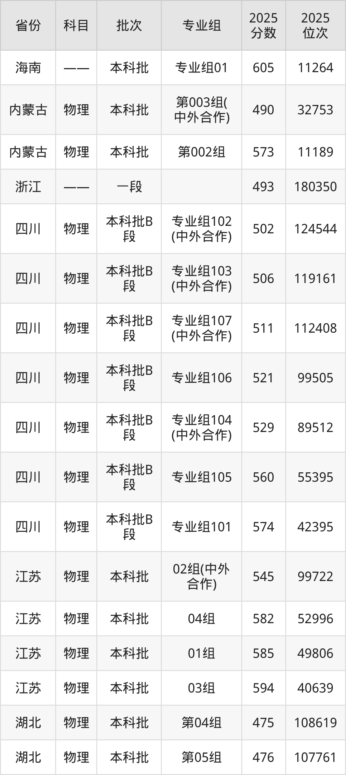 2025年在本科物理类进行招生,各专业组分数线详情如下: