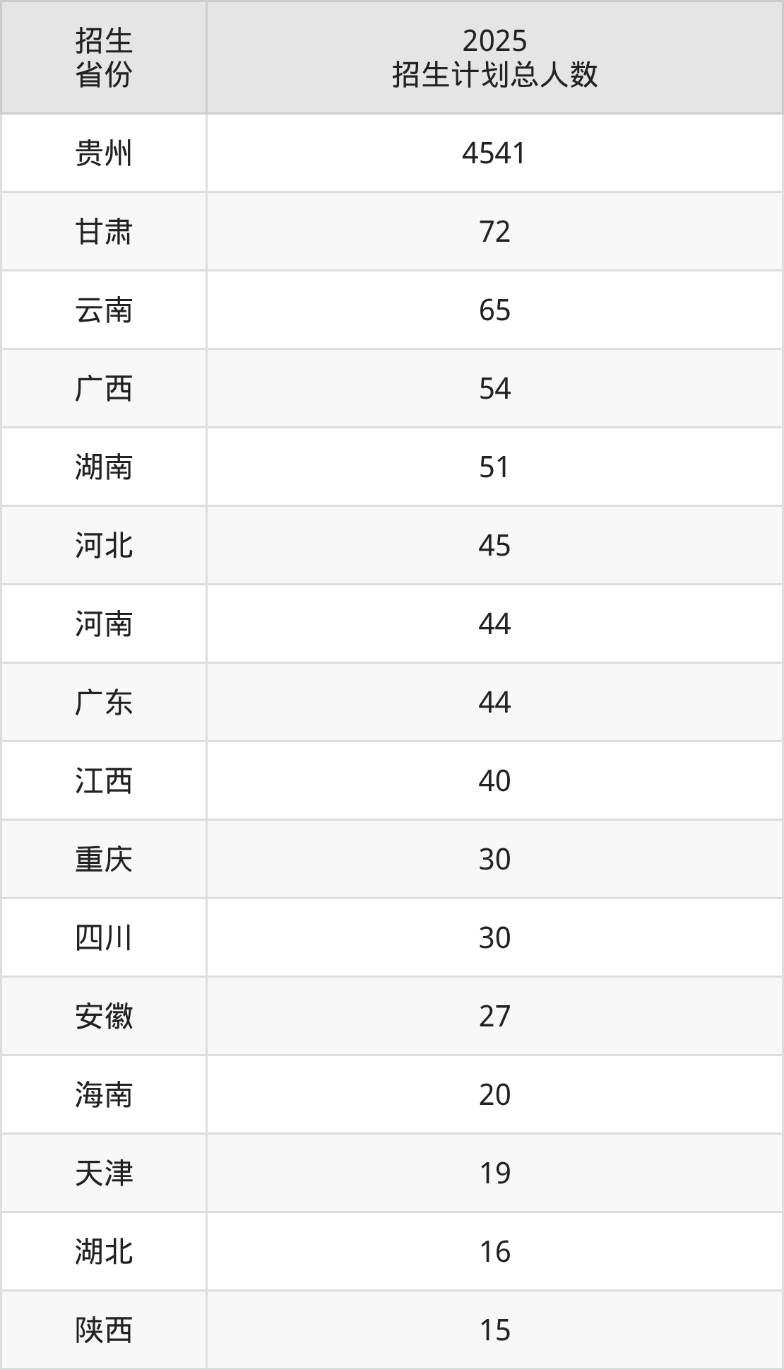2025年贵州医科大学面向全国27个省市开展本科招生;招生专业共42个,招生人数共5189人。2025年在贵州省招生计划总人数是4541人,其中,贵州医科大学在贵州省招生人数最多的是临床医学。贵州医科大学在各省具体招生人数情况如下表。
