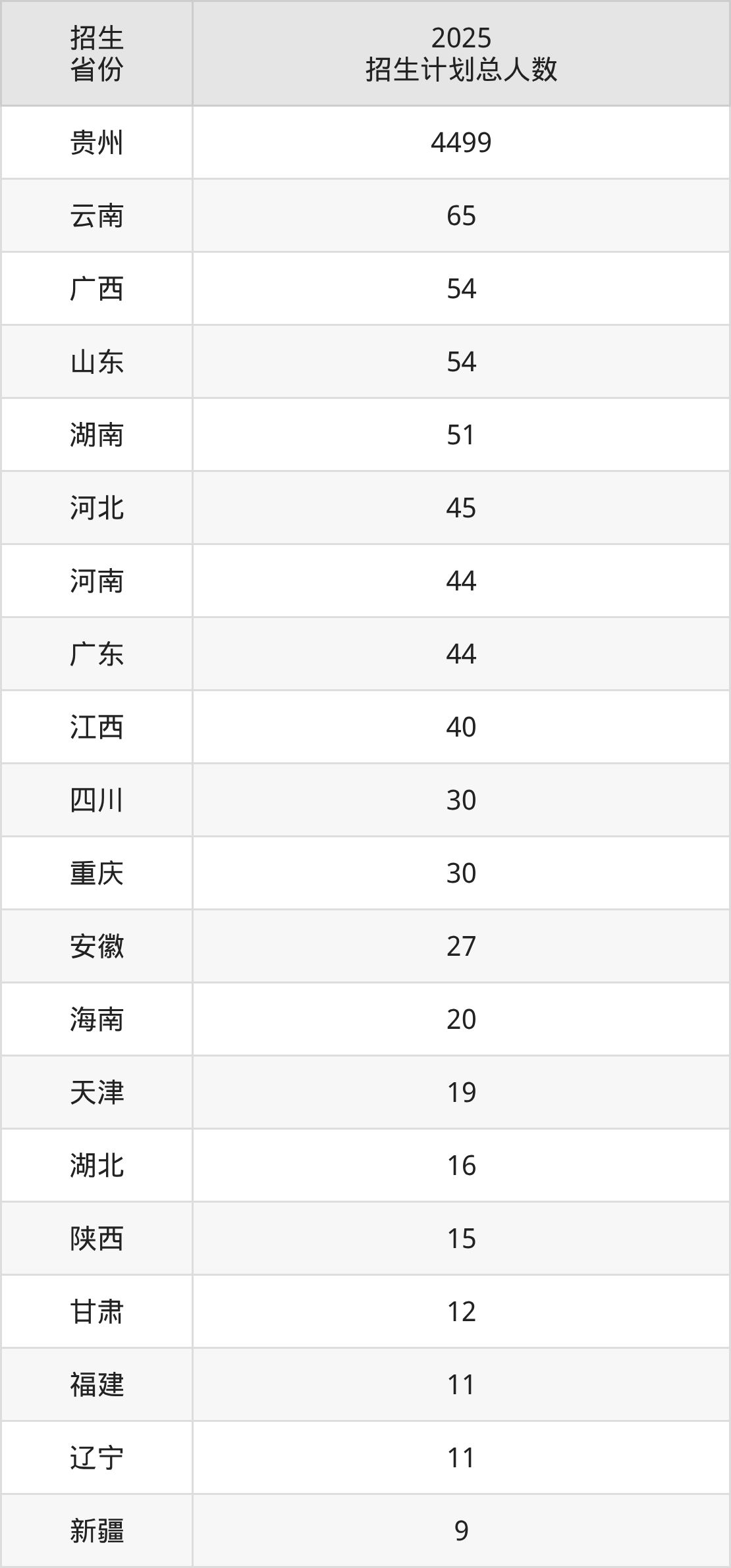2025年贵州医科大学面向全国28个省市开展本科招生;招生专业共42个,招生人数共5141人。2025年在贵州省招生计划总人数是4499人,其中,贵州医科大学在贵州省招生人数最多的是临床医学。贵州医科大学在各省具体招生人数情况如下表。