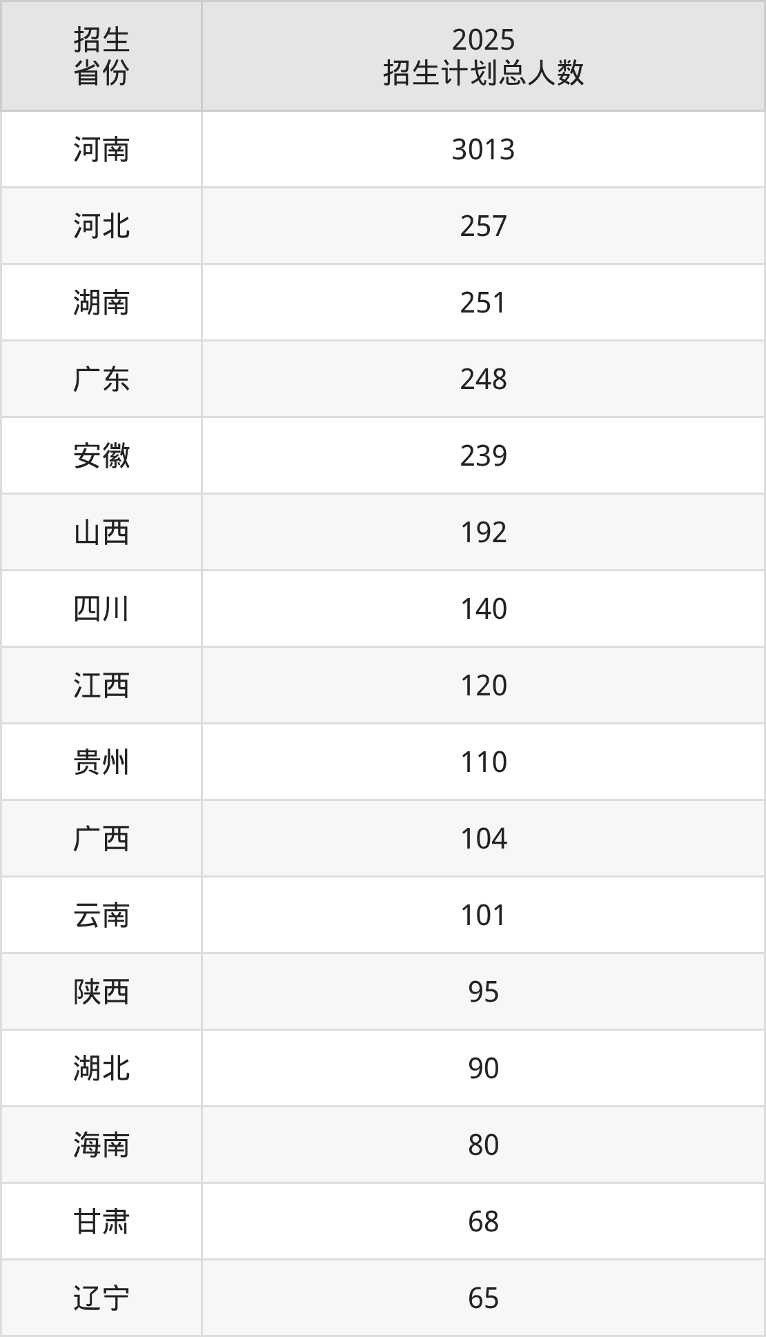 2025年河南大学面向全国28个省市开展本科招生;招生专业共62个,招生人数共5650人。2025年在河南省招生计划总人数是3013人,其中,河南大学在河南省招生人数最多的是临床医学类。河南大学在各省具体招生人数情况如下表。