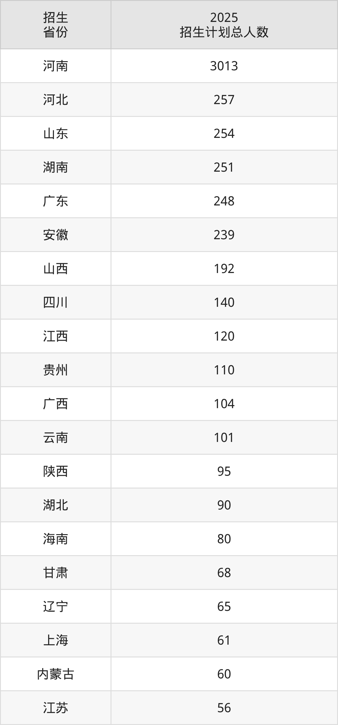 2025年河南大学面向全国29个省市开展本科招生;招生专业共62个,招生人数共5904人。2025年在河南省招生计划总人数是3013人,其中,河南大学在河南省招生人数最多的是临床医学类。河南大学在各省具体招生人数情况如下表。