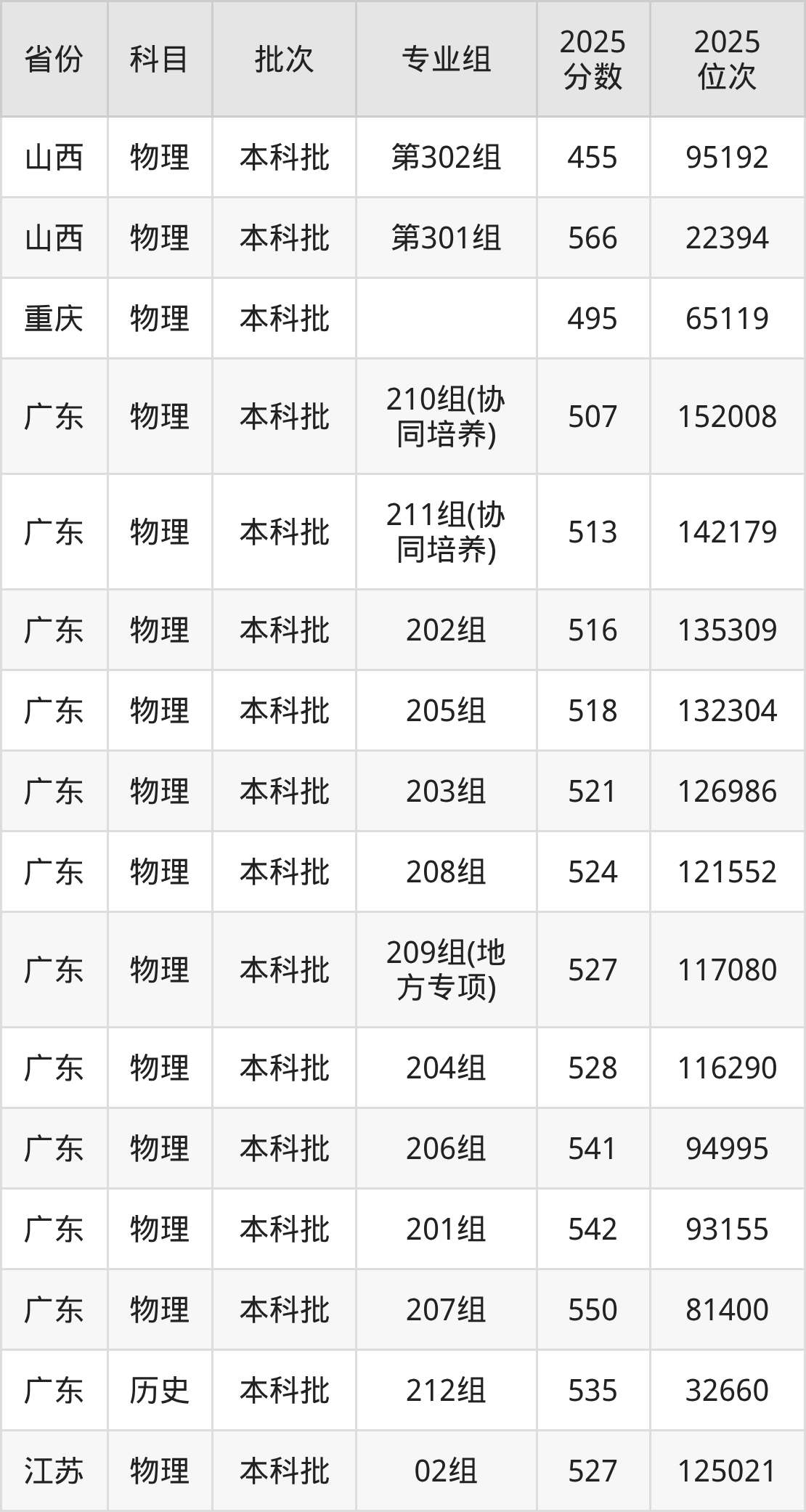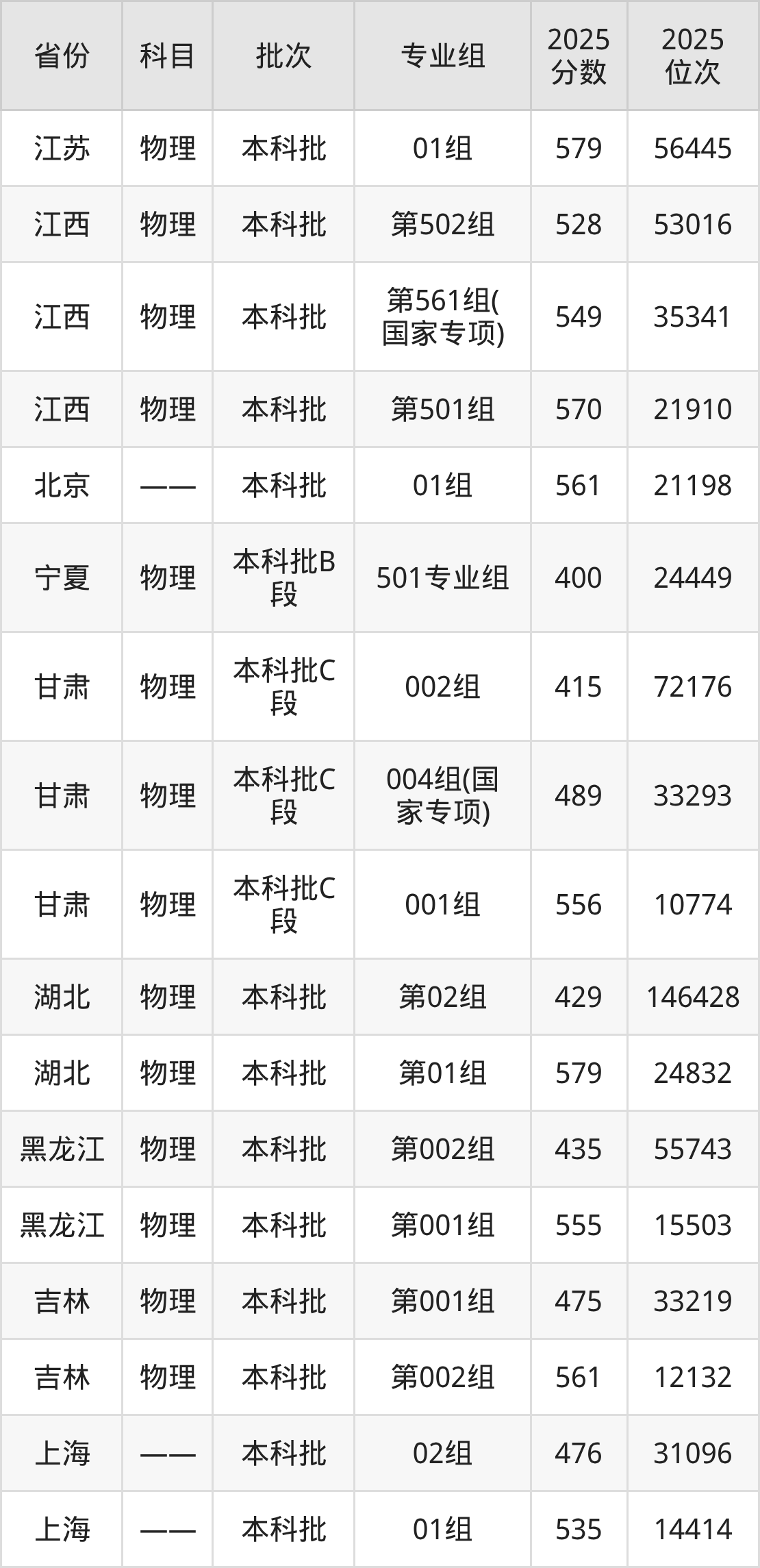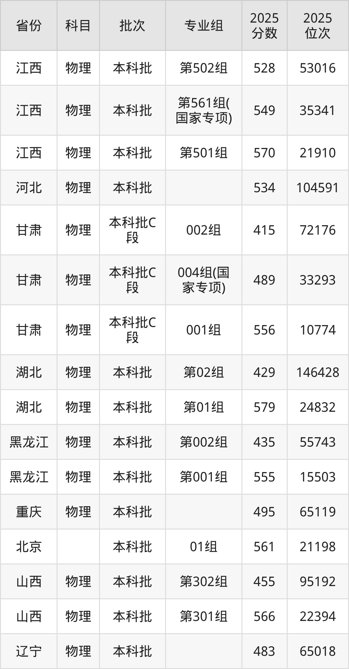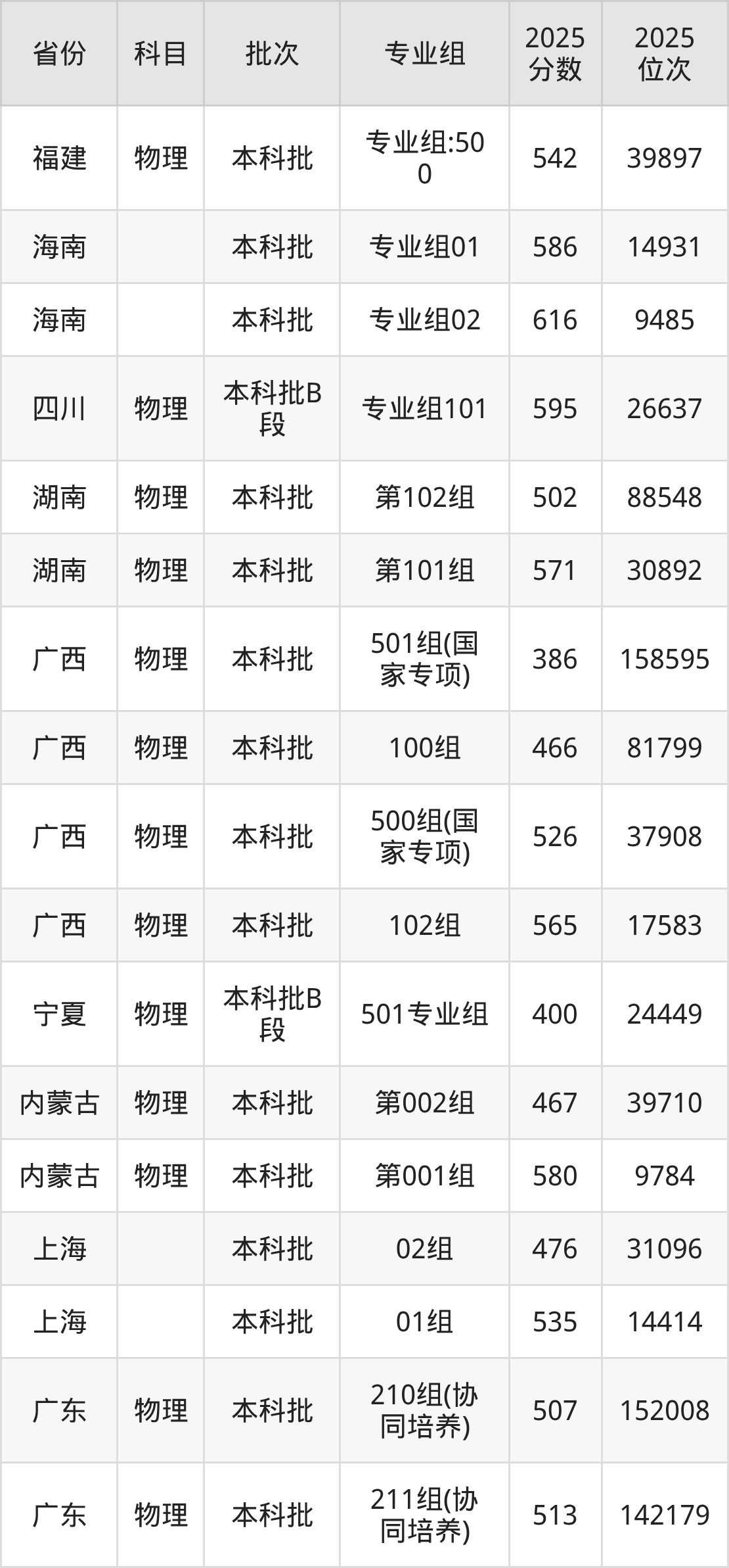 2025年在本科物理类进行招生,各专业组分数线详情如下: