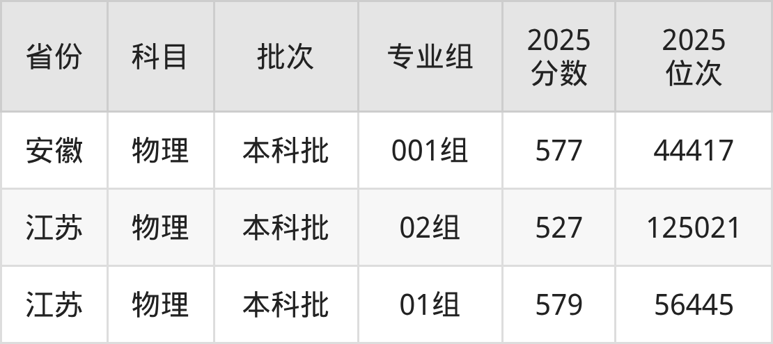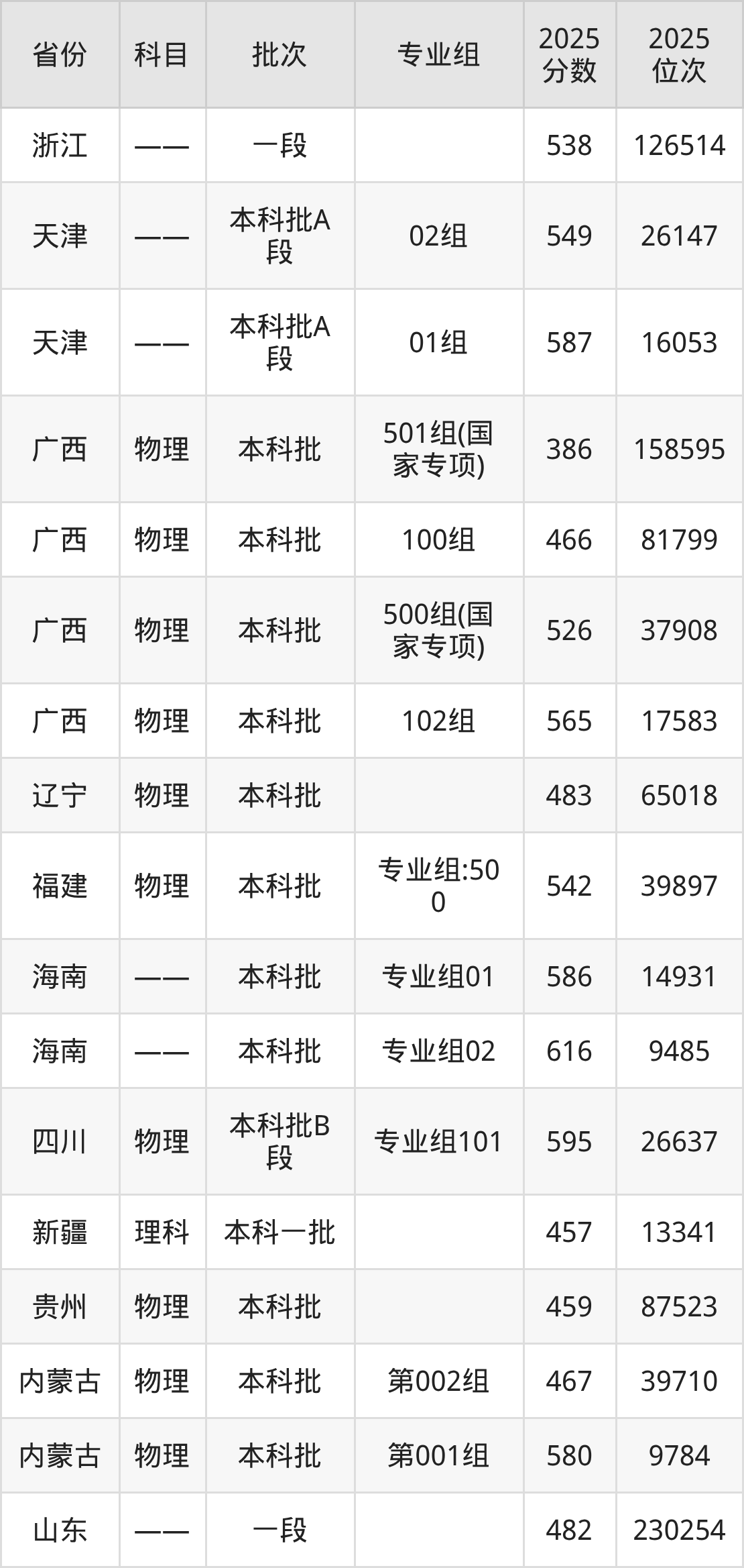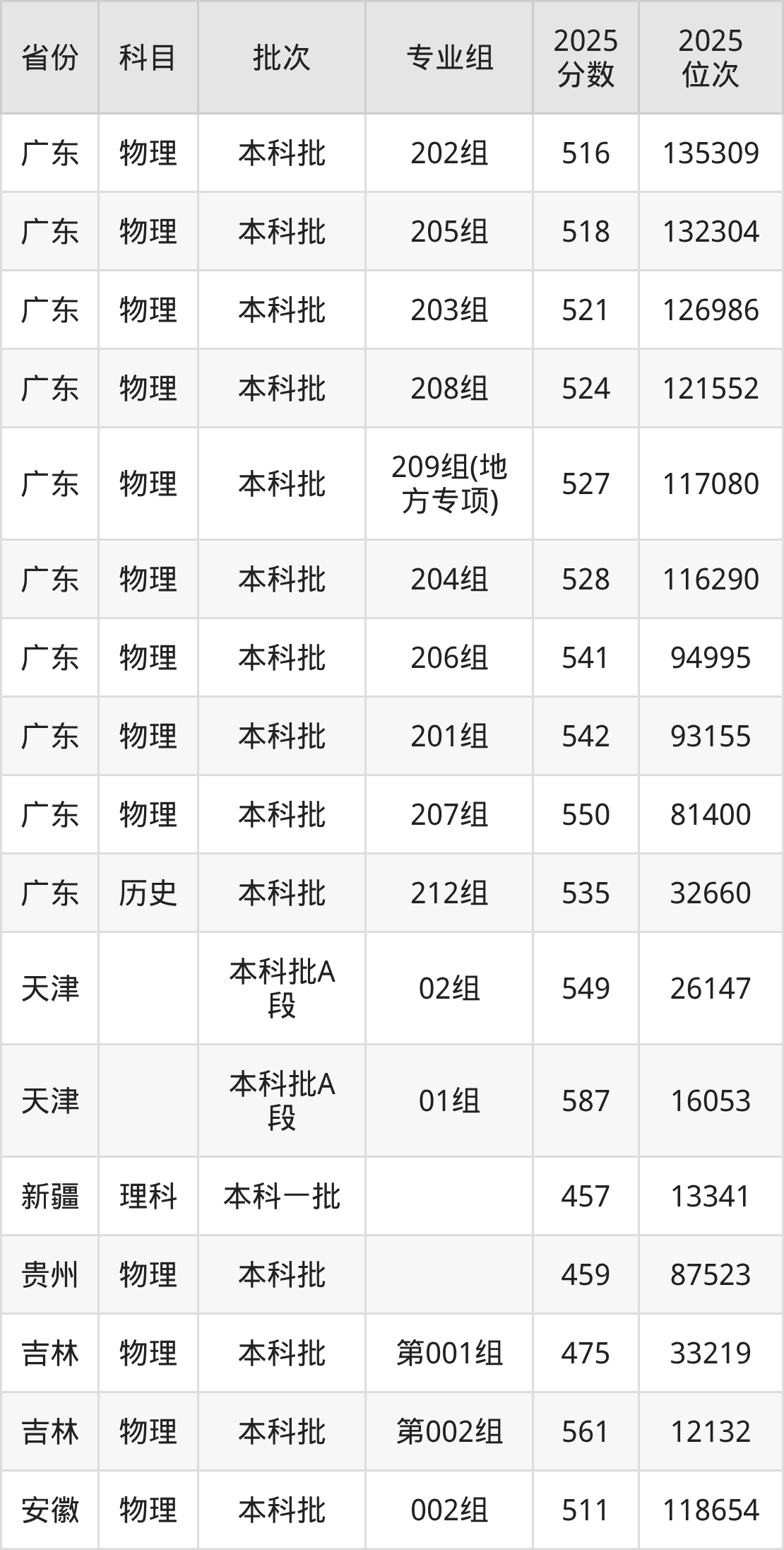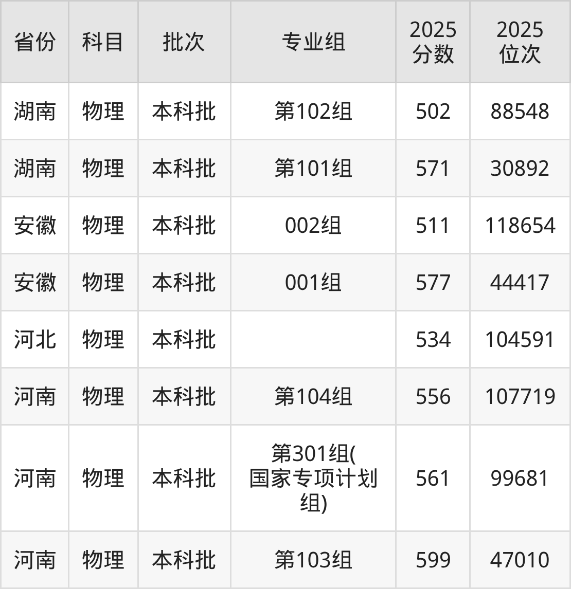 2025年在本科物理类进行招生,各专业组分数线详情如下:
