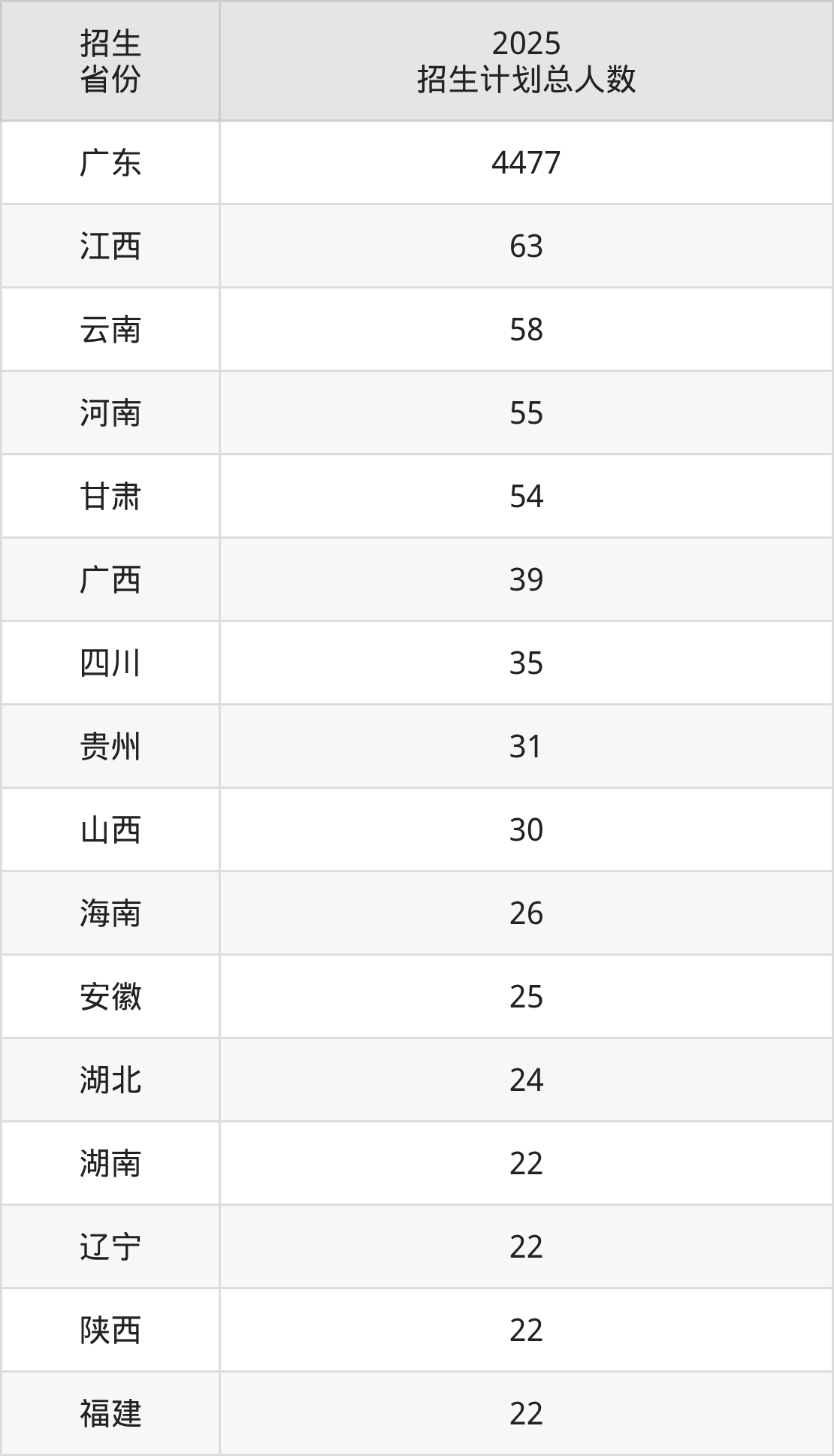 2025年广东医科大学面向全国28个省市开展本科招生;招生专业共37个,招生人数共5192人。2025年在广东省招生计划总人数是4477人,其中,广东医科大学在广东省招生人数最多的是临床医学。广东医科大学在各省具体招生人数情况如下表。
