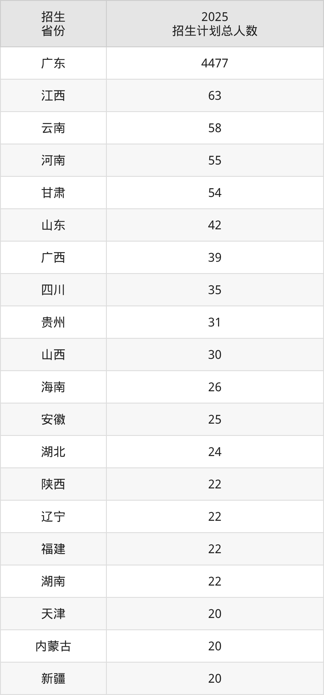 2025年广东医科大学面向全国29个省市开展本科招生;招生专业共37个,招生人数共5234人。2025年在广东省招生计划总人数是4477人,其中,广东医科大学在广东省招生人数最多的是临床医学。广东医科大学在各省具体招生人数情况如下表。