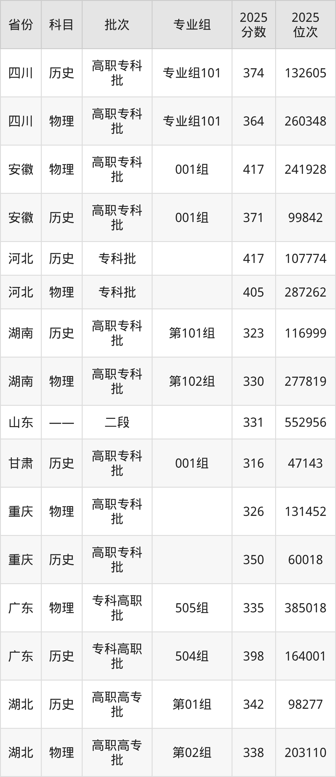 普通类专科历史类最低371分,专科物理类最低417分