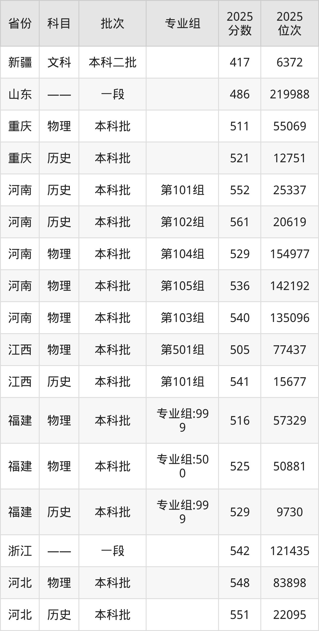 2025年在本科文科进行招生,各专业组分数线详情如下: