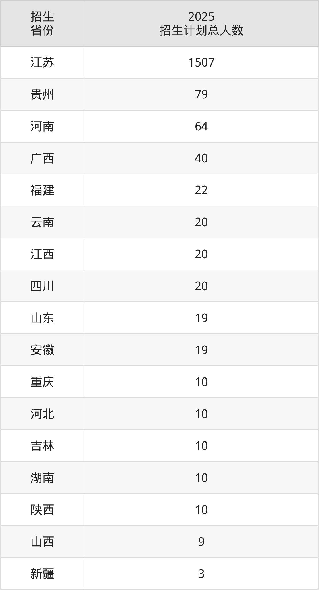 2025年江苏第二师范学院面向全国17个省市开展本科招生;招生专业共33个,招生人数共1872人。2025年在江苏省招生计划总人数是1507人,其中,江苏第二师范学院在江苏省招生人数最多的是计算机科学与技术。江苏第二师范学院在各省具体招生人数情况如下表。