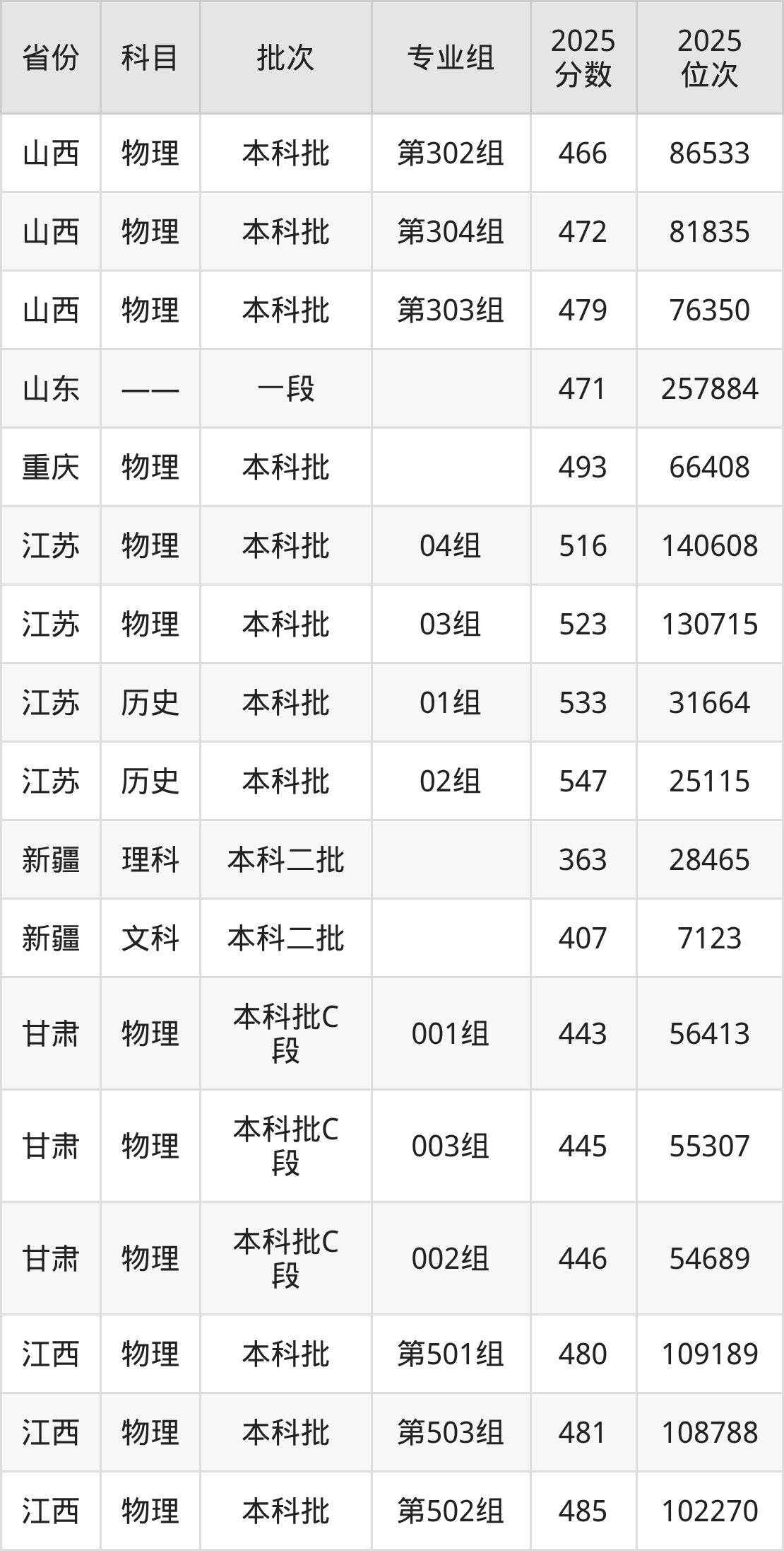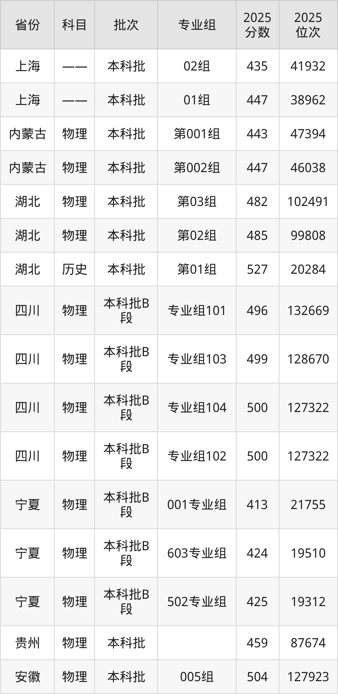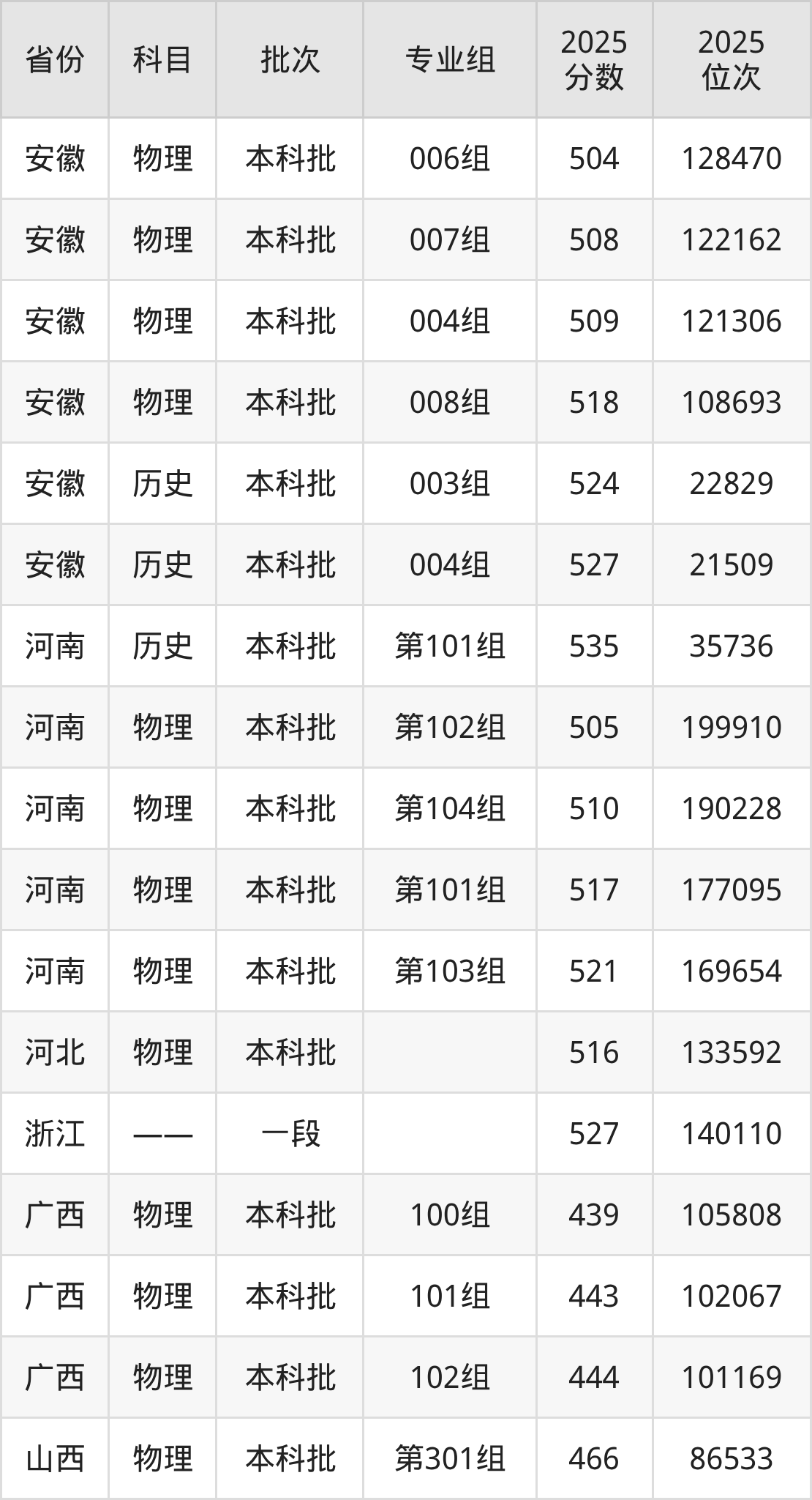 2025年在本科物理类进行招生,各专业组分数线详情如下: