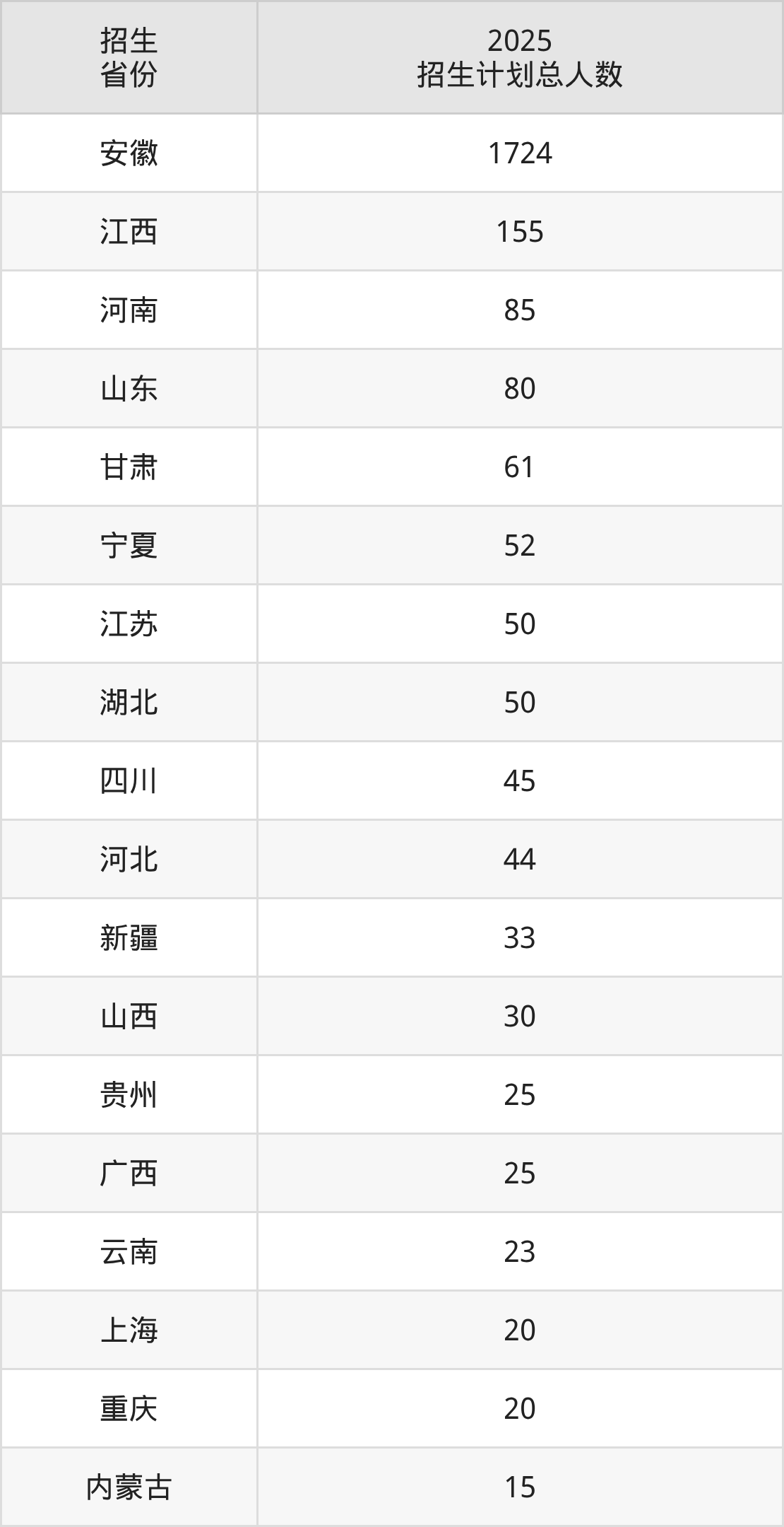 2025年淮南师范学院面向全国18个省市开展本科招生;招生专业共38个,招生人数共2537人。2025年在安徽省招生计划总人数是1724人,其中,淮南师范学院在安徽省招生人数最多的是计算机科学与技术。淮南师范学院在各省具体招生人数情况如下表。