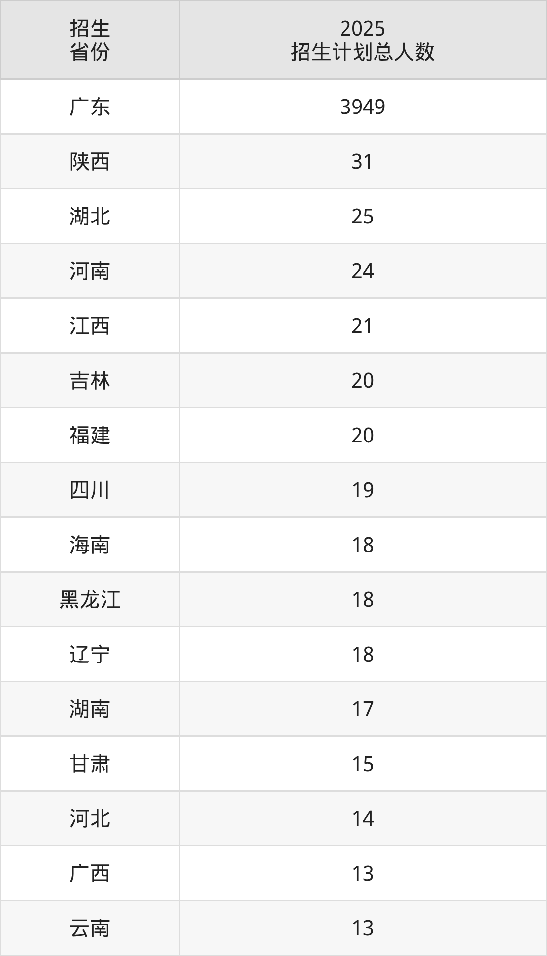 2025年广州软件学院面向全国21个省市开展本科招生;招生专业共28个,招生人数共4282人。2025年在广东省招生计划总人数是3949人,其中,广州软件学院在广东省招生人数最多的是计算机科学与技术。广州软件学院在各省具体招生人数情况如下表。