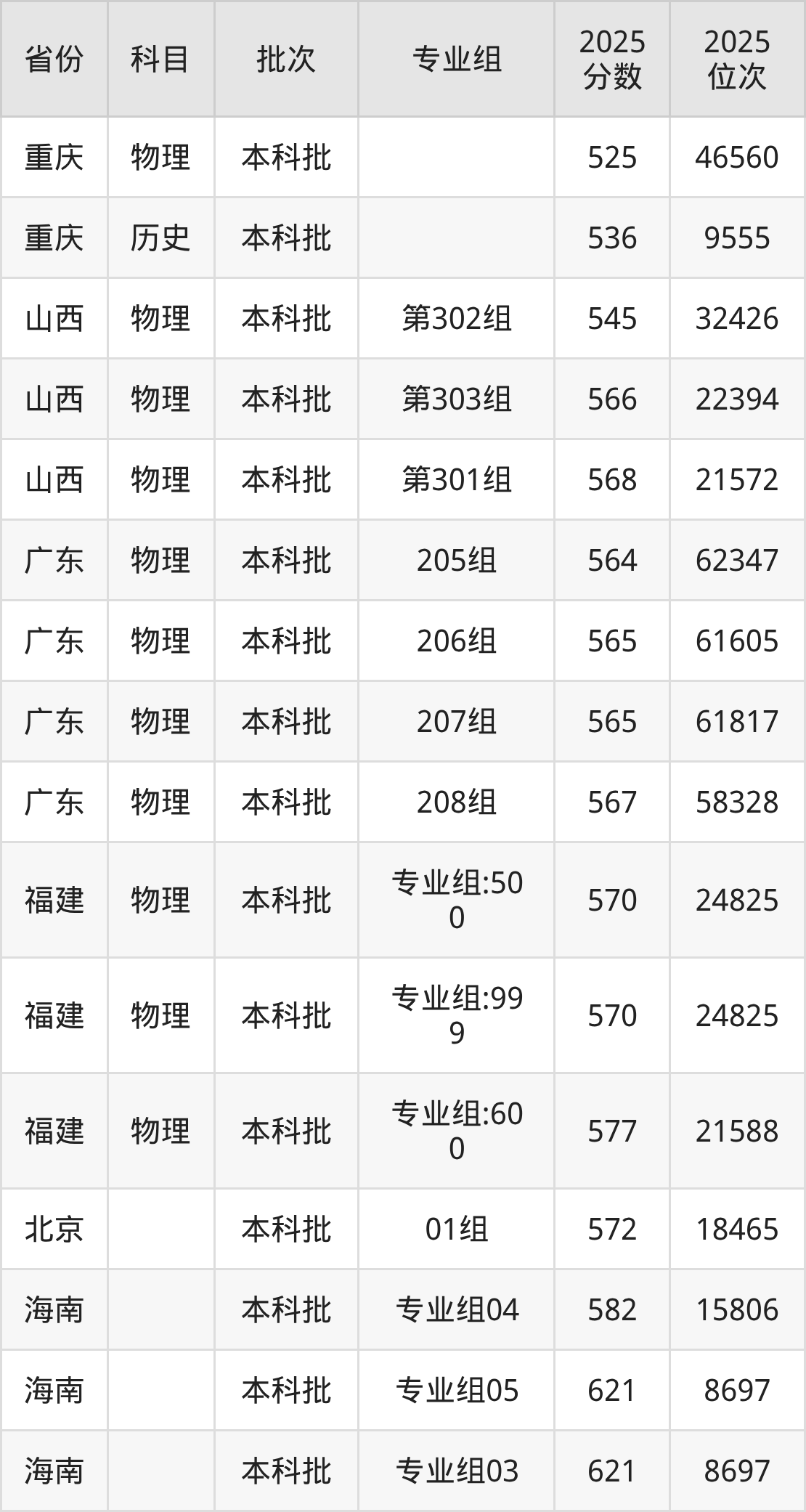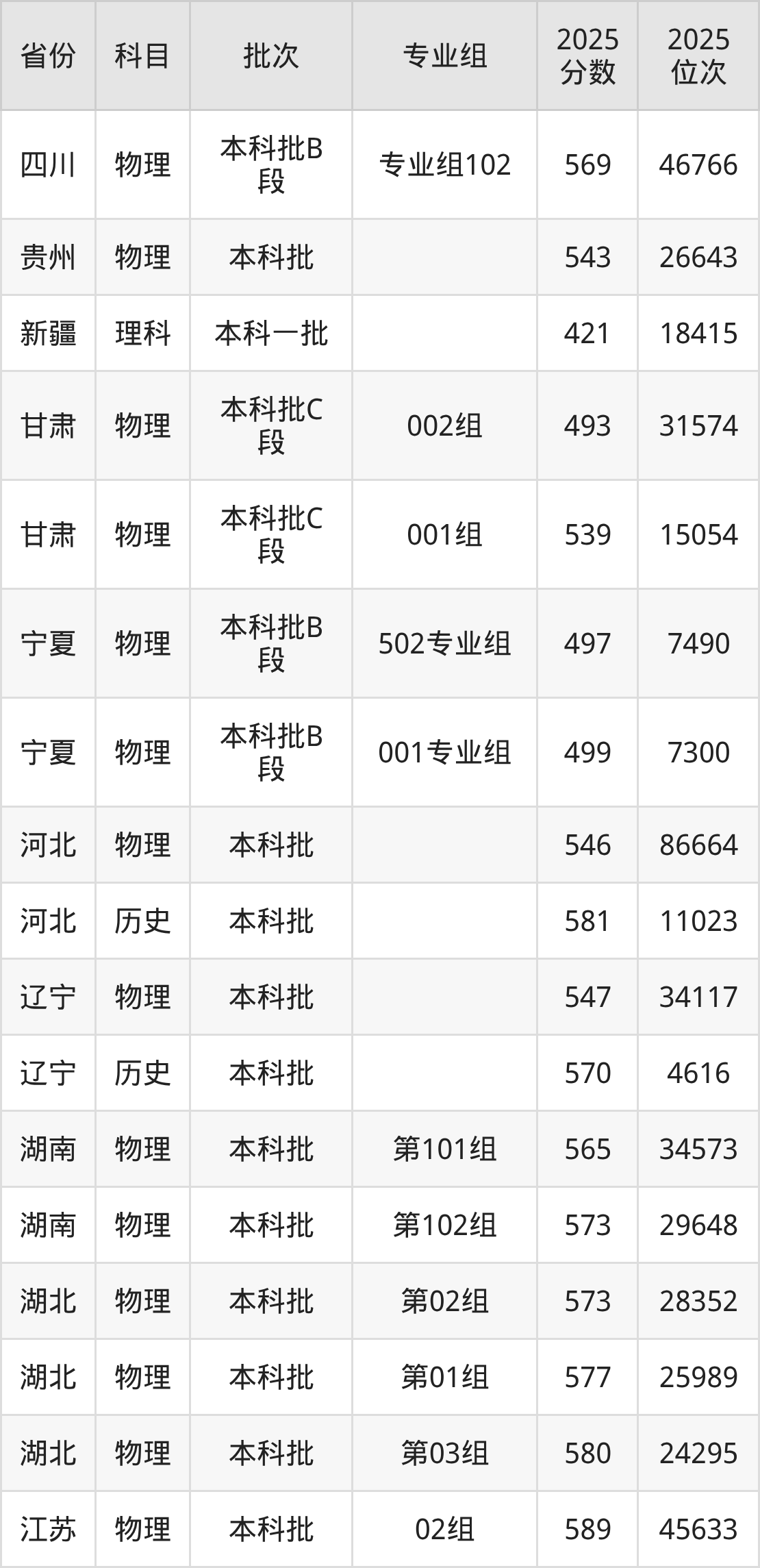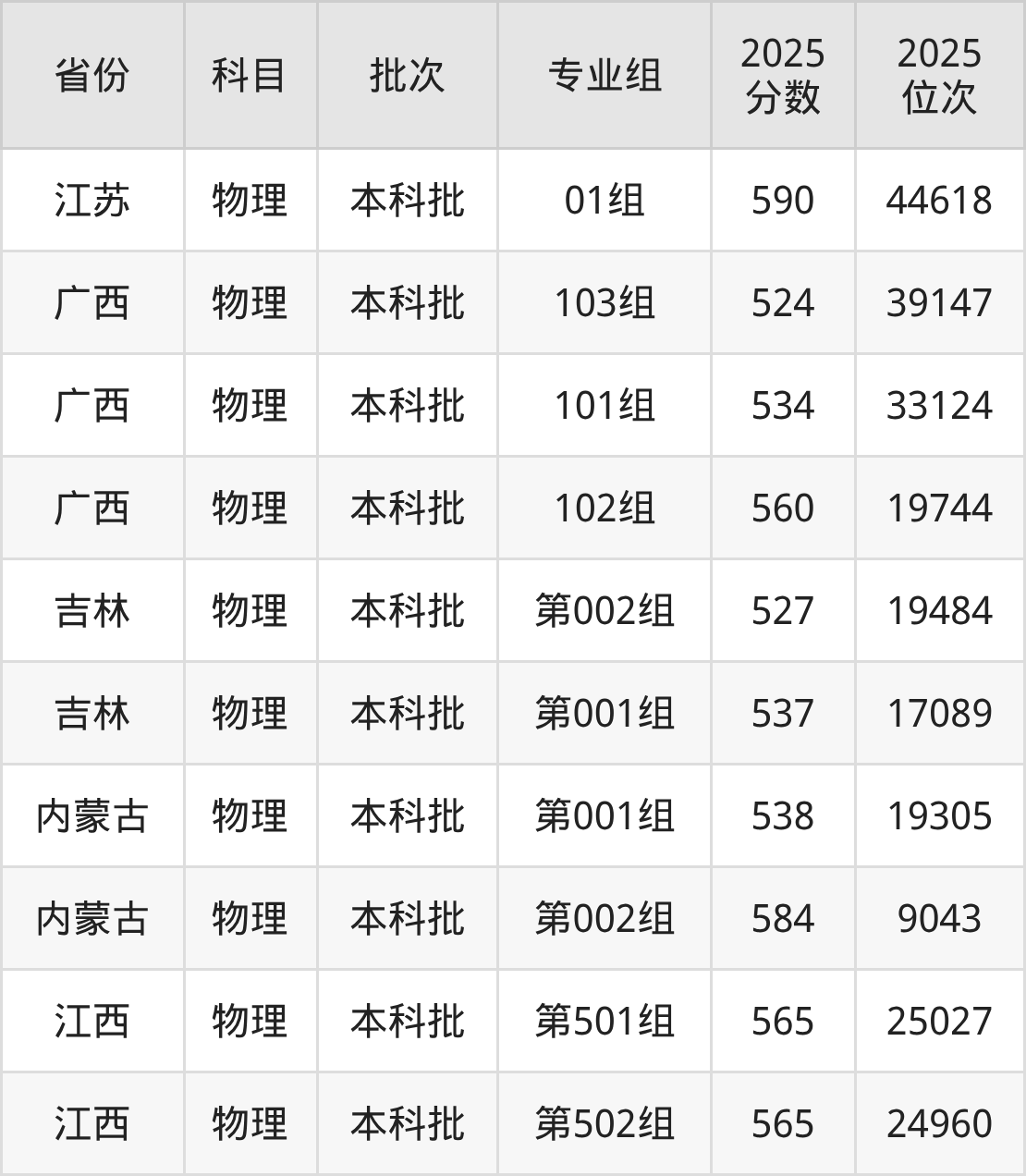 2025年在本科物理类进行招生,各专业组分数线详情如下: