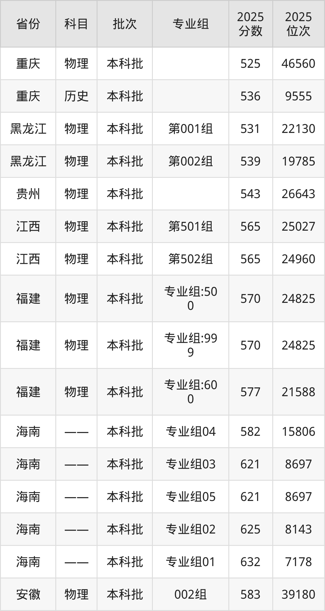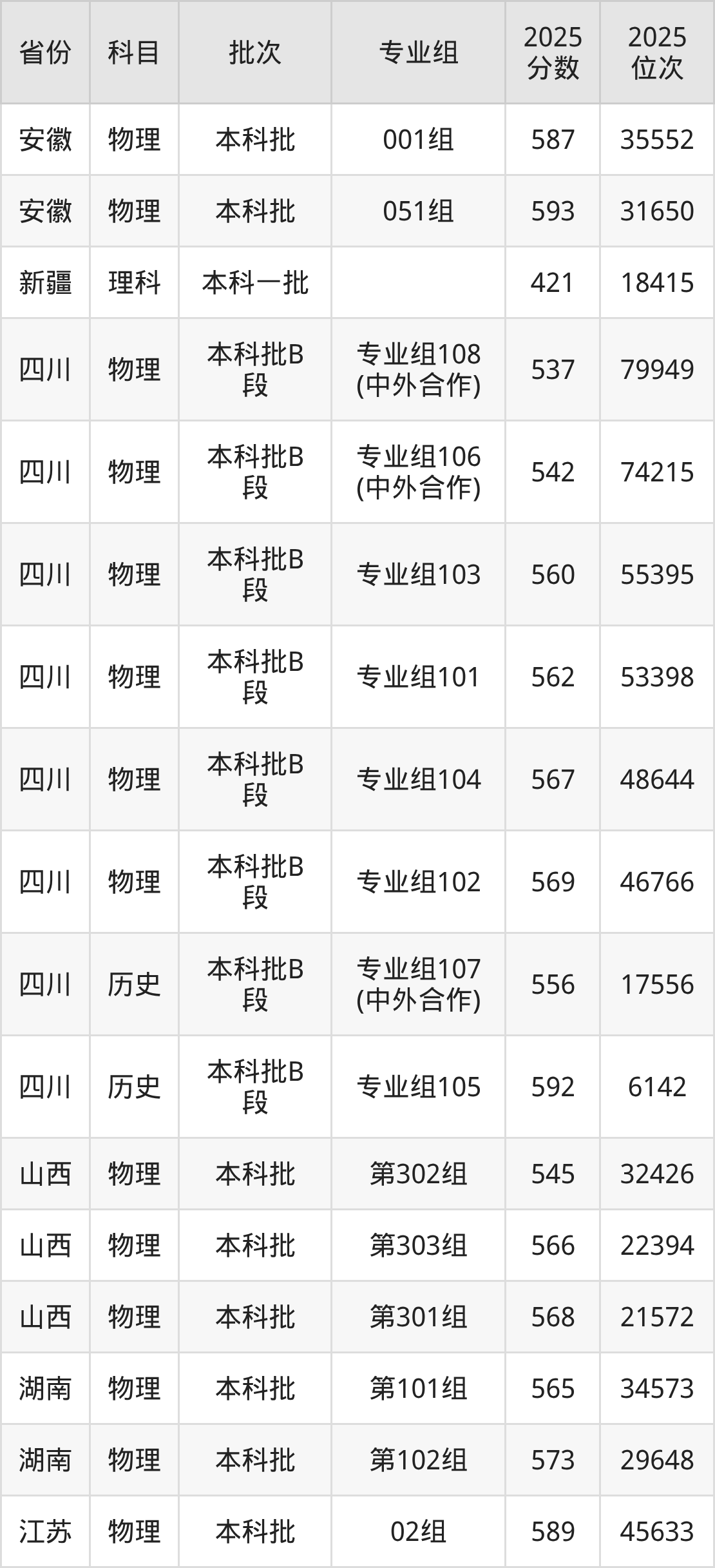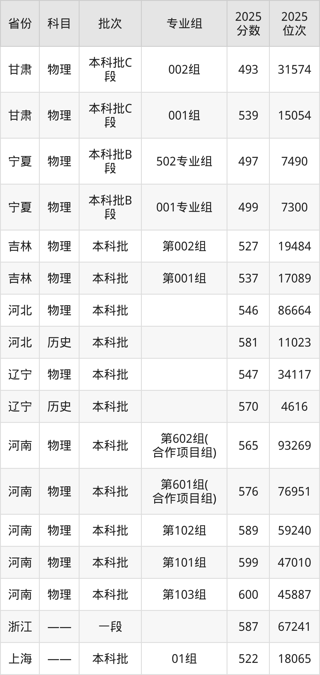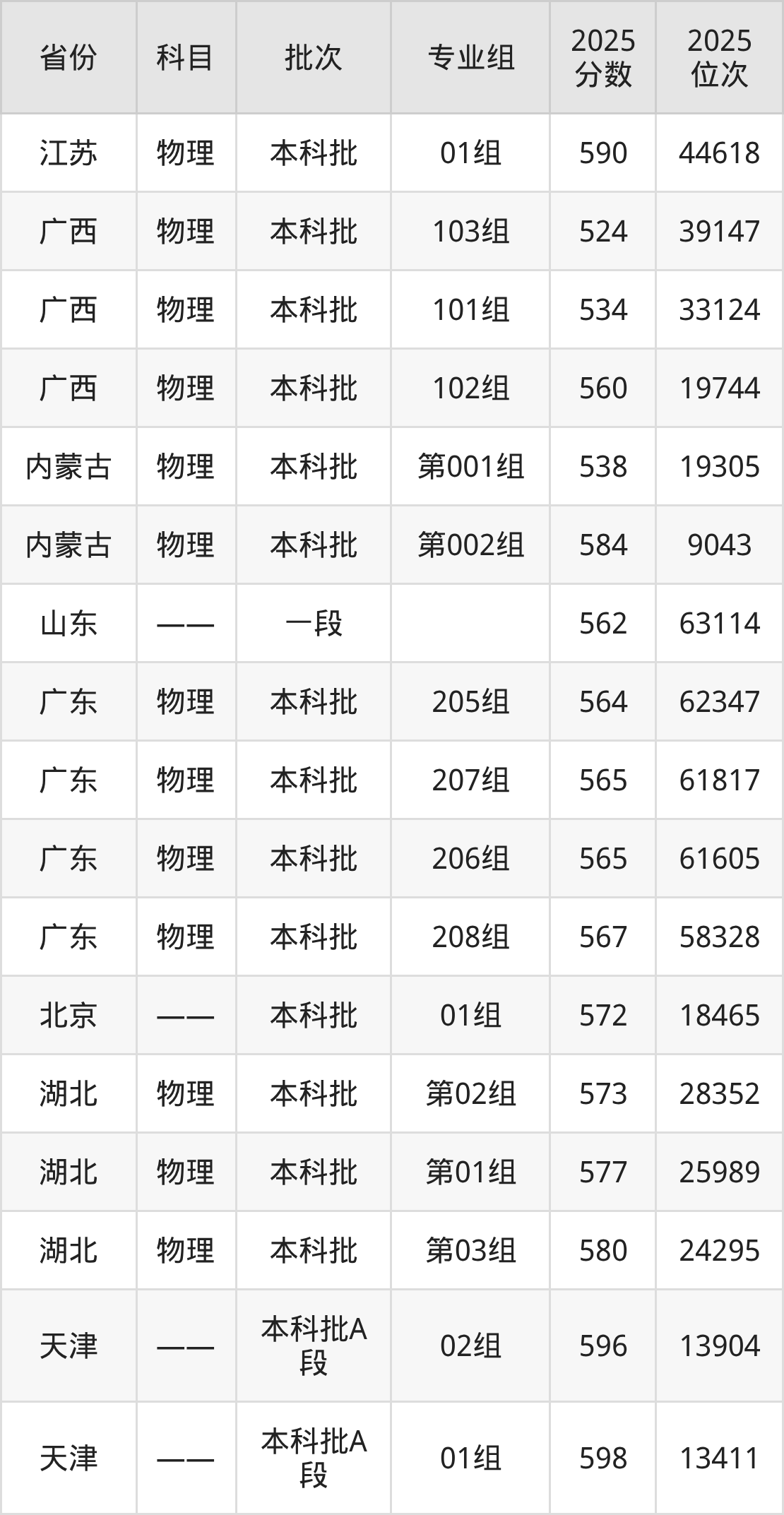 2025年在本科物理类进行招生,各专业组分数线详情如下: