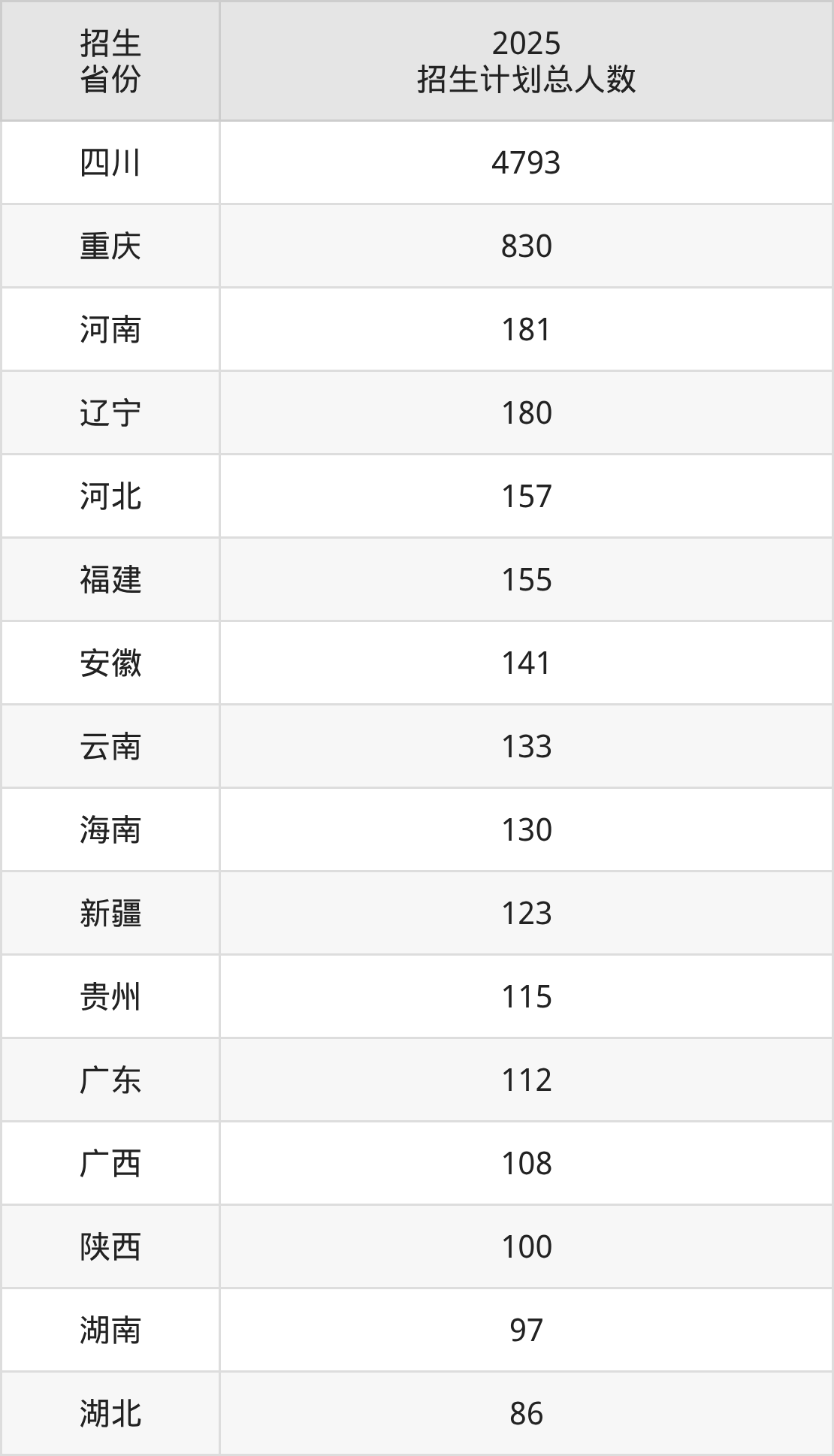 2025年四川农业大学面向全国28个省市开展本科招生;招生专业共68个,招生人数共7929人。2025年在四川省招生计划总人数是4793人,其中,四川农业大学在四川省招生人数最多的是动物科学。四川农业大学在各省具体招生人数情况如下表。