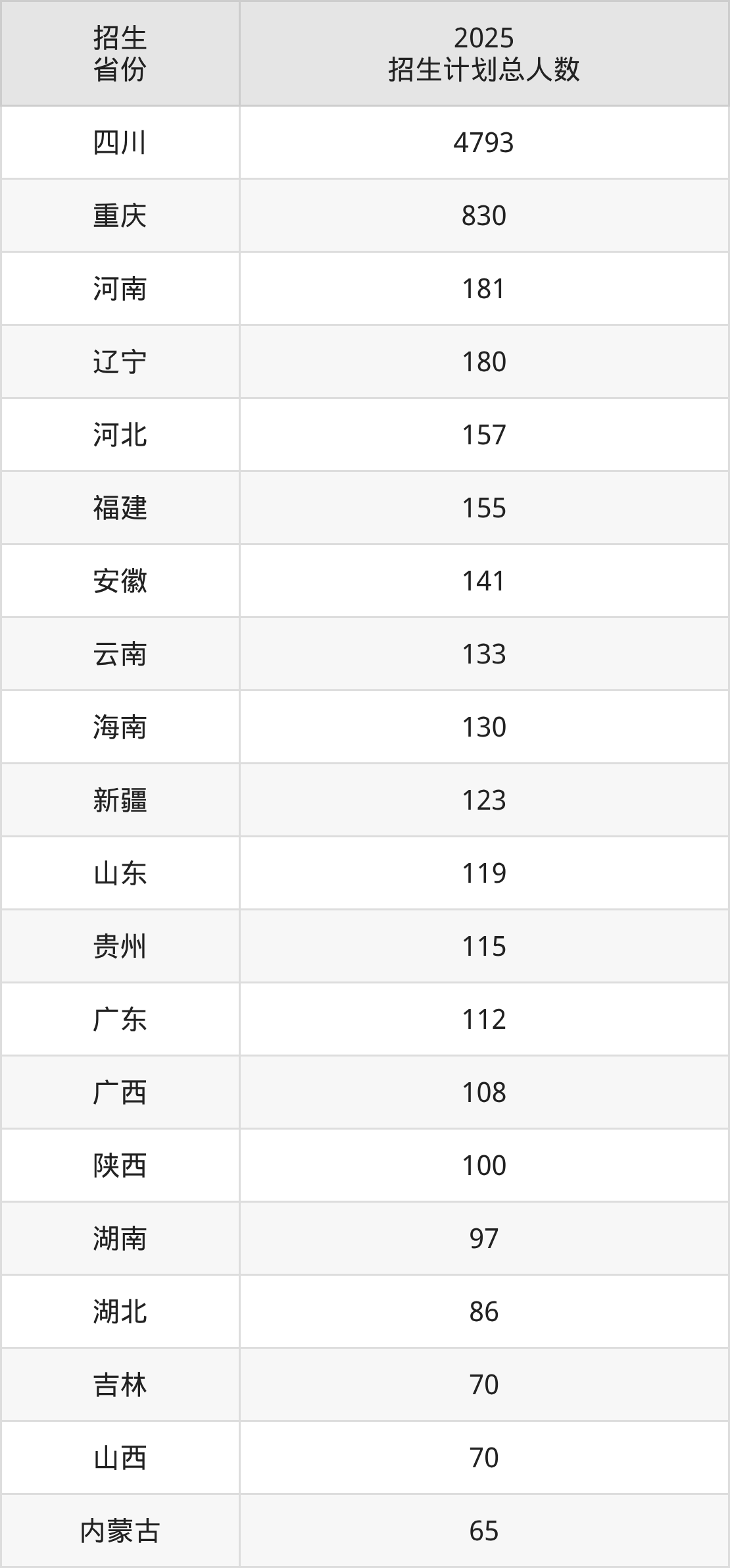 2025年四川农业大学面向全国29个省市开展本科招生;招生专业共68个,招生人数共8048人。2025年在四川省招生计划总人数是4793人,其中,四川农业大学在四川省招生人数最多的是动物科学。四川农业大学在各省具体招生人数情况如下表。
