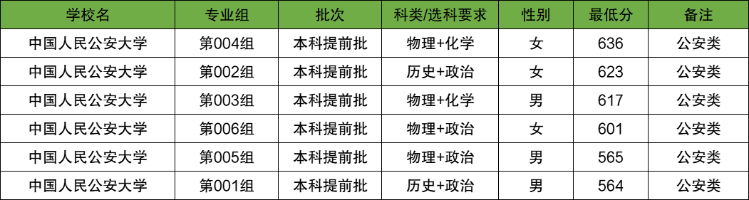 2025年该校公安类专业在黑龙江提前批招生分数中,女生分数最高的是第004组,2025年最低录取分为636分;女生分数最低的是第006组,2025年最低录取分为601分。