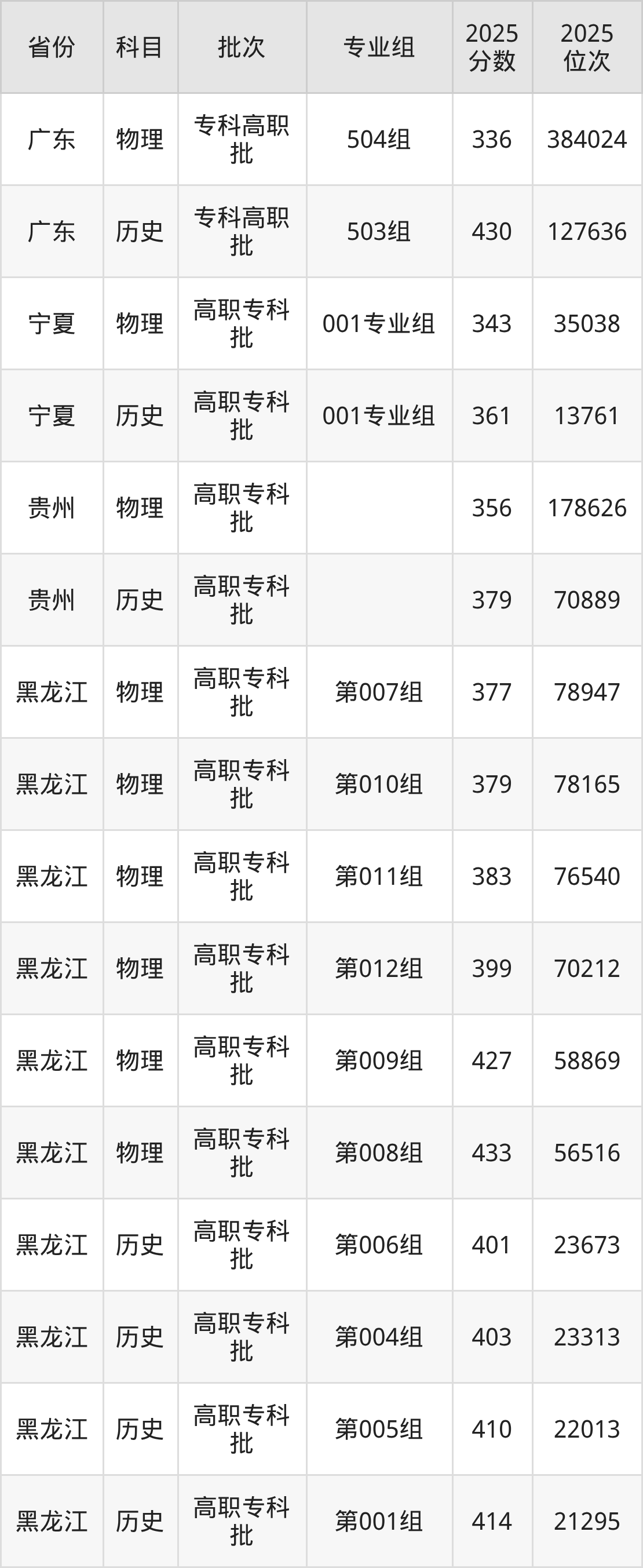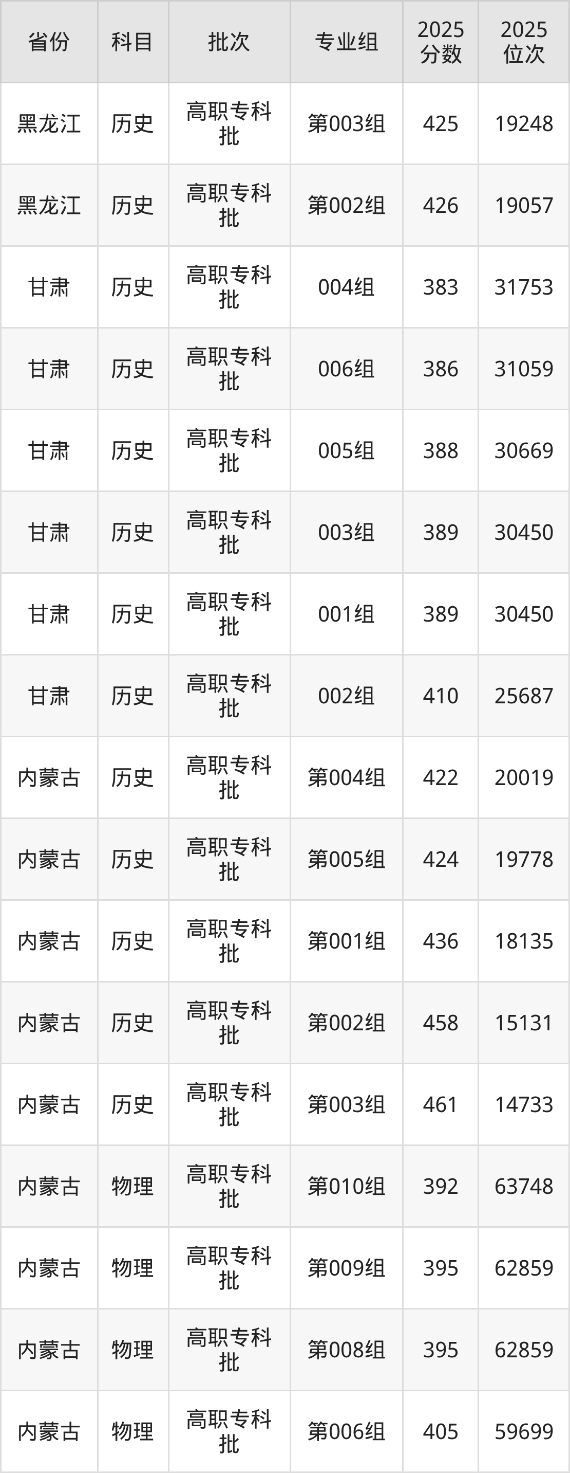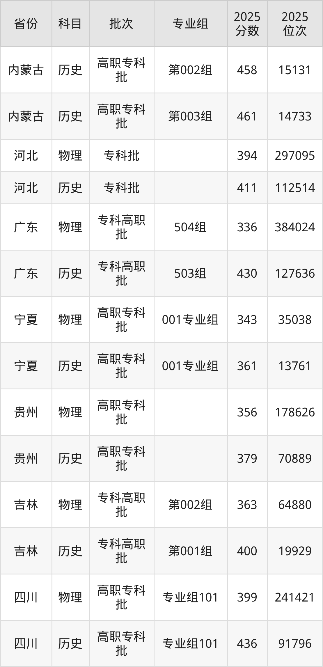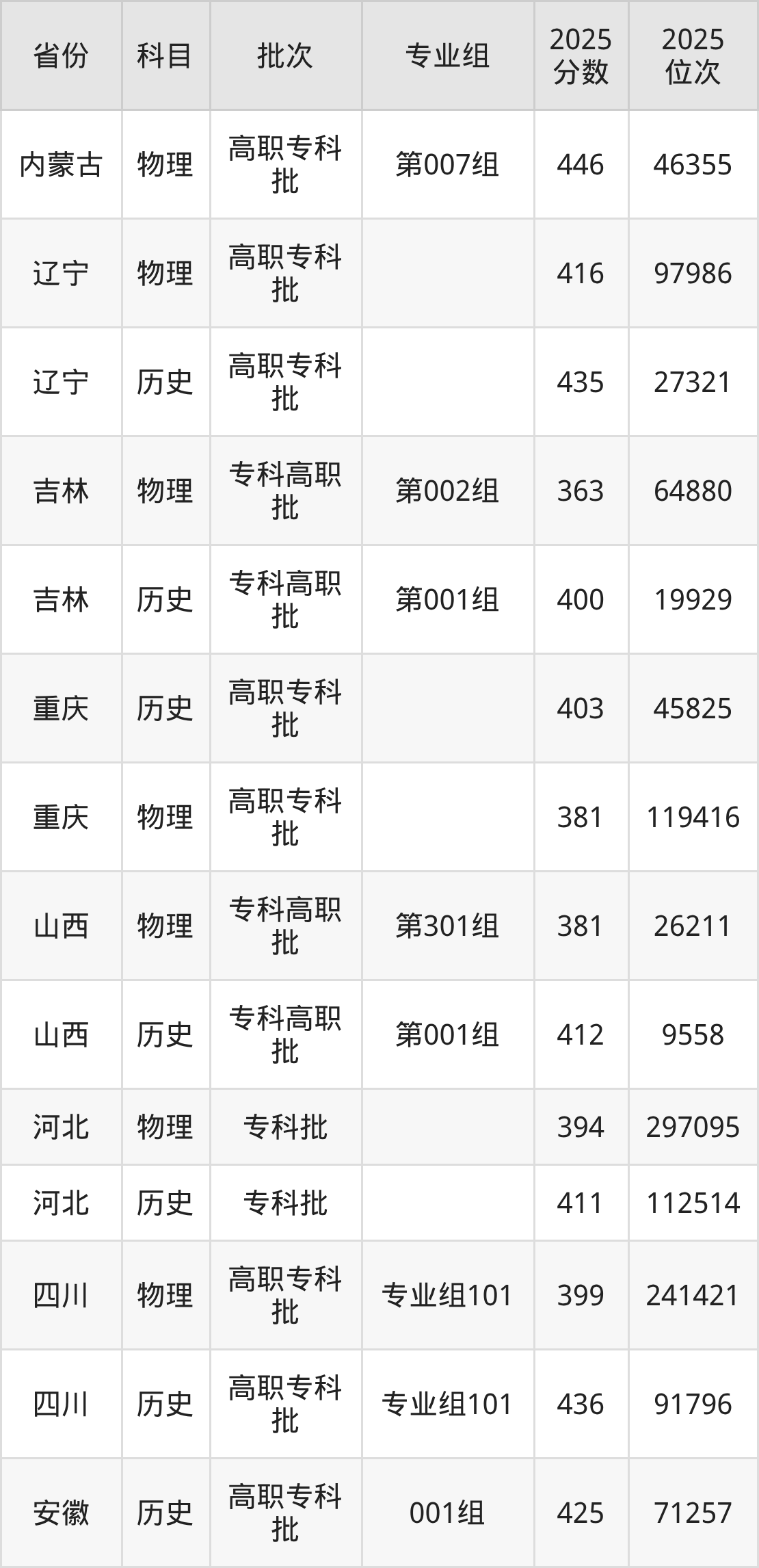 2025年在专科历史类进行招生,各专业组分数线详情如下: