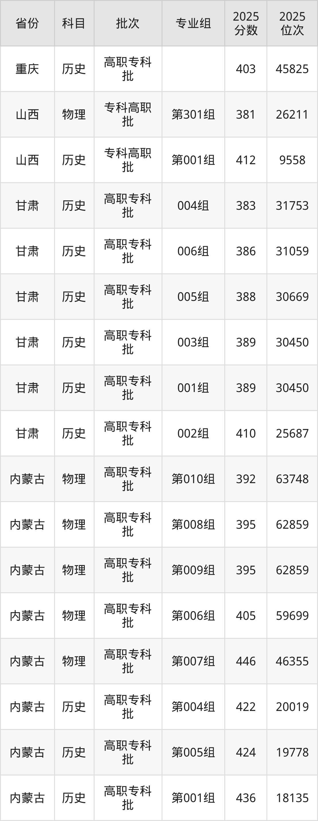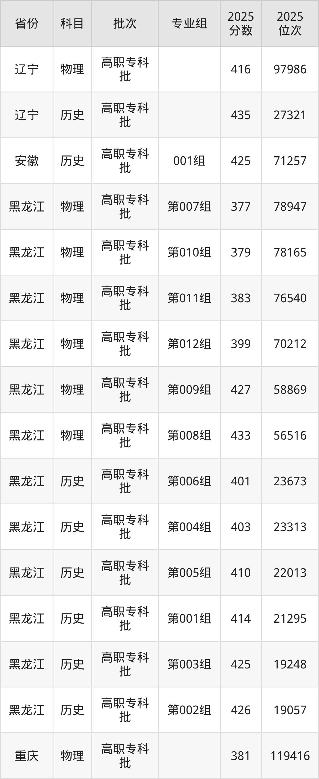 唐山职业技术学院第010组:2025年投档录取最低分为379分,录取最低位次为78165名。