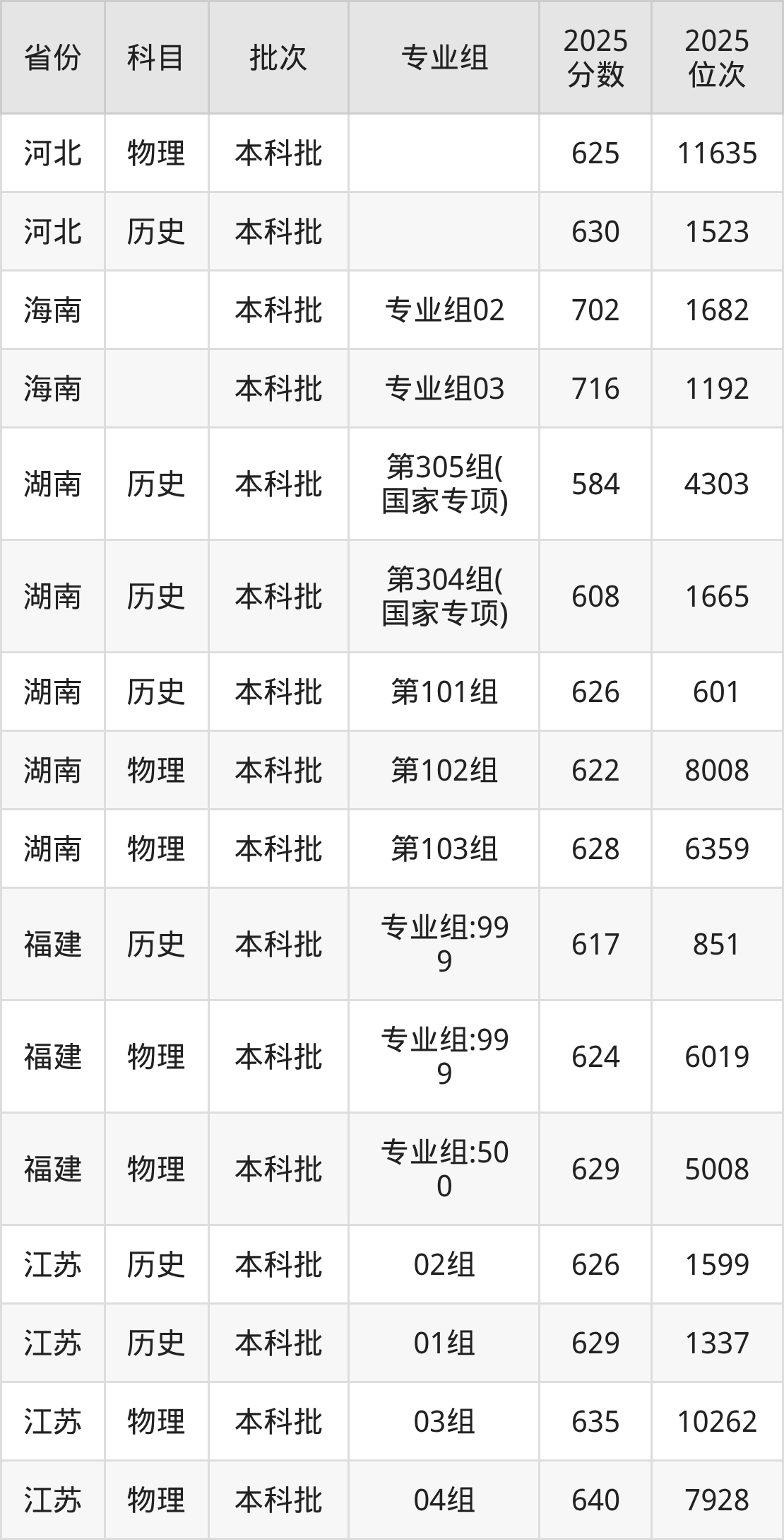 法学(涉外法治实验班、财经法治卓越班):2025年投档录取最低分为642分。