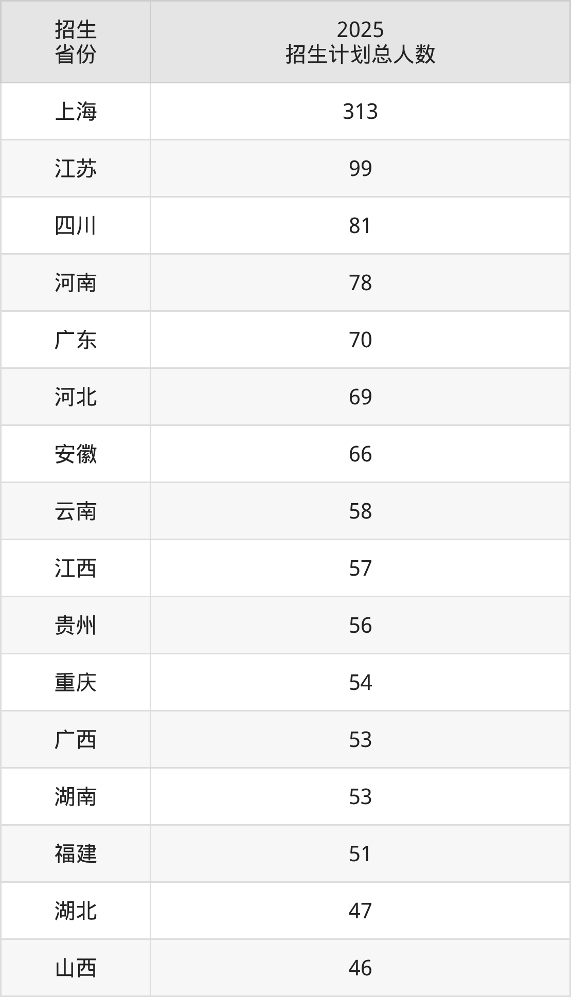 2025年上海财经大学面向全国28个省市开展本科招生;招生专业共25个,招生人数共1612人。2025年在上海市招生计划总人数是313人,其中,上海财经大学在上海市招生人数最多的是统计学类。上海财经大学在各省具体招生人数情况如下表。