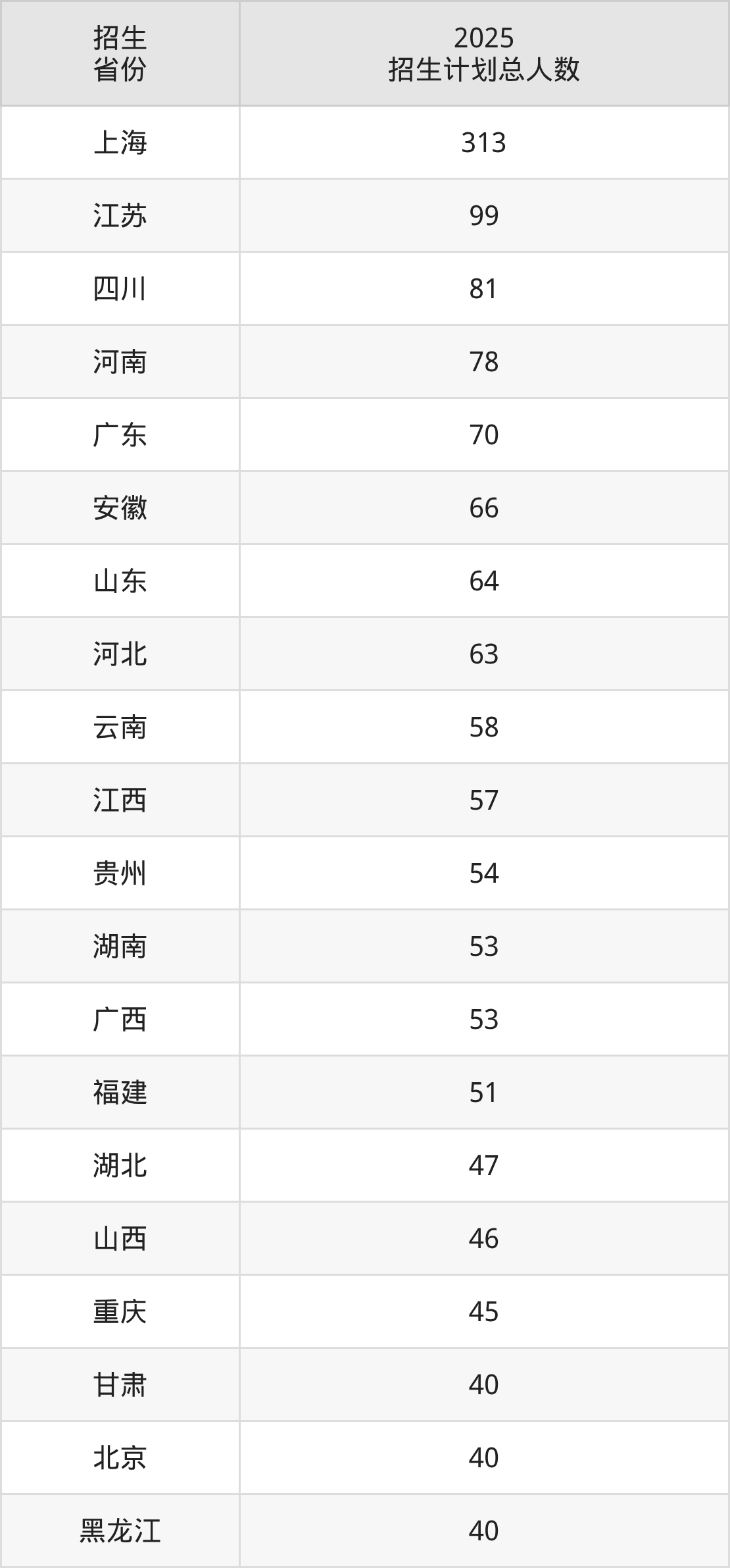 2025年上海财经大学面向全国29个省市开展本科招生;招生专业共25个,招生人数共1659人。2025年在上海市招生计划总人数是313人,其中,上海财经大学在上海市招生人数最多的是统计学类。上海财经大学在各省具体招生人数情况如下表。