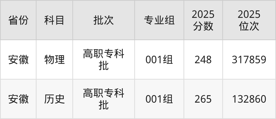 蚌埠城市轨道交通职业学院001组:2025年投档录取最低分为248分,录取最低位次为317859名。