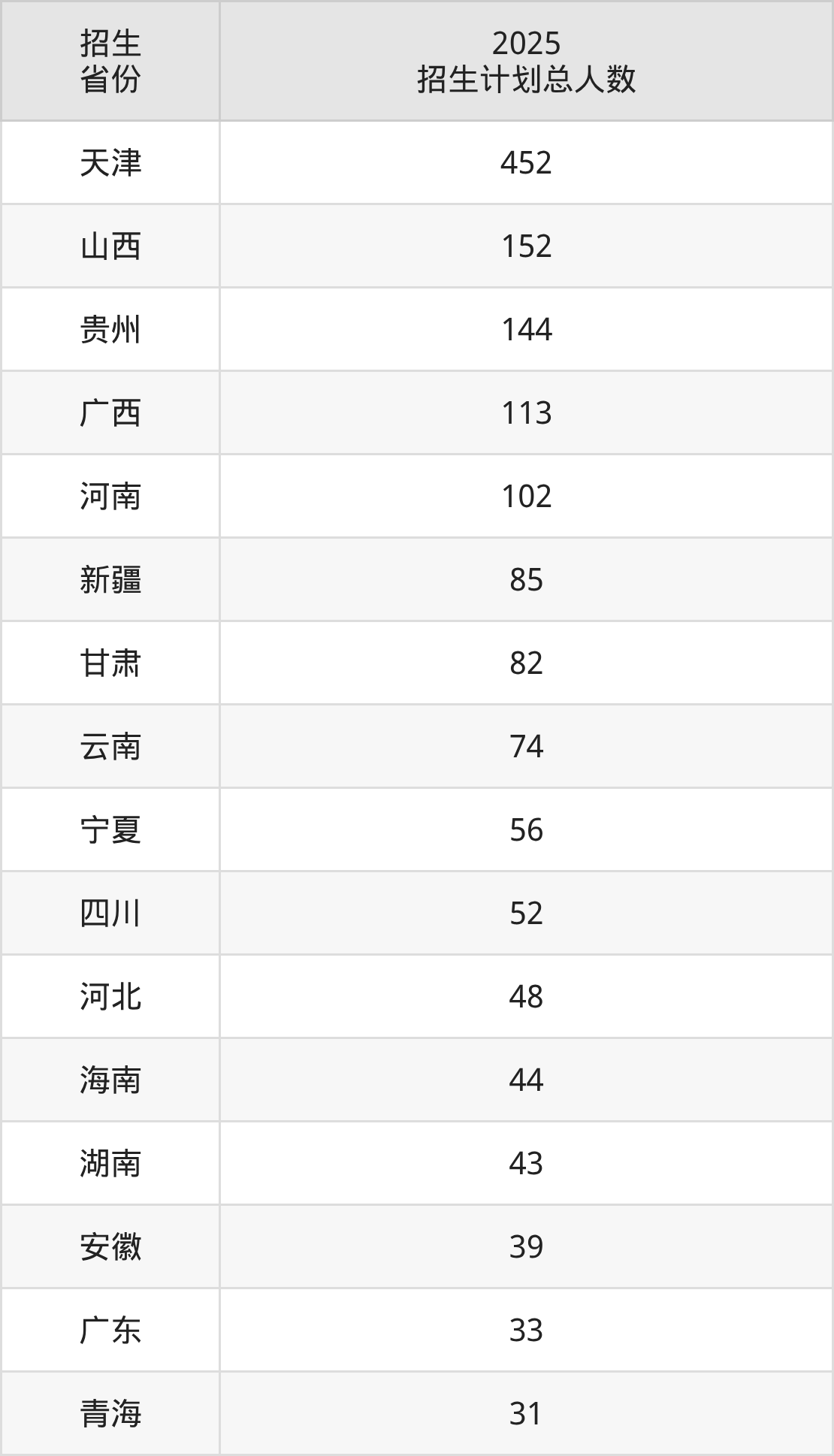 2025年天津职业技术师范大学面向全国28个省市开展本科招生;招生专业共41个,招生人数共1730人。2025年在天津市招生计划总人数是452人,其中,天津职业技术师范大学在天津市招生人数最多的是电子信息工程。天津职业技术师范大学在各省具体招生人数情况如下表。