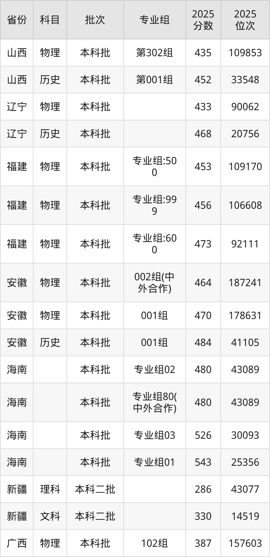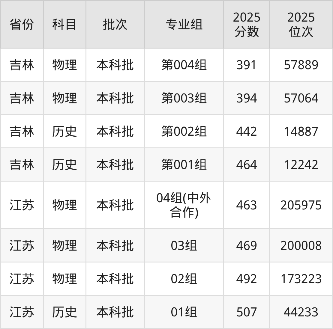 2025年在本科物理类进行招生,各专业组分数线详情如下: