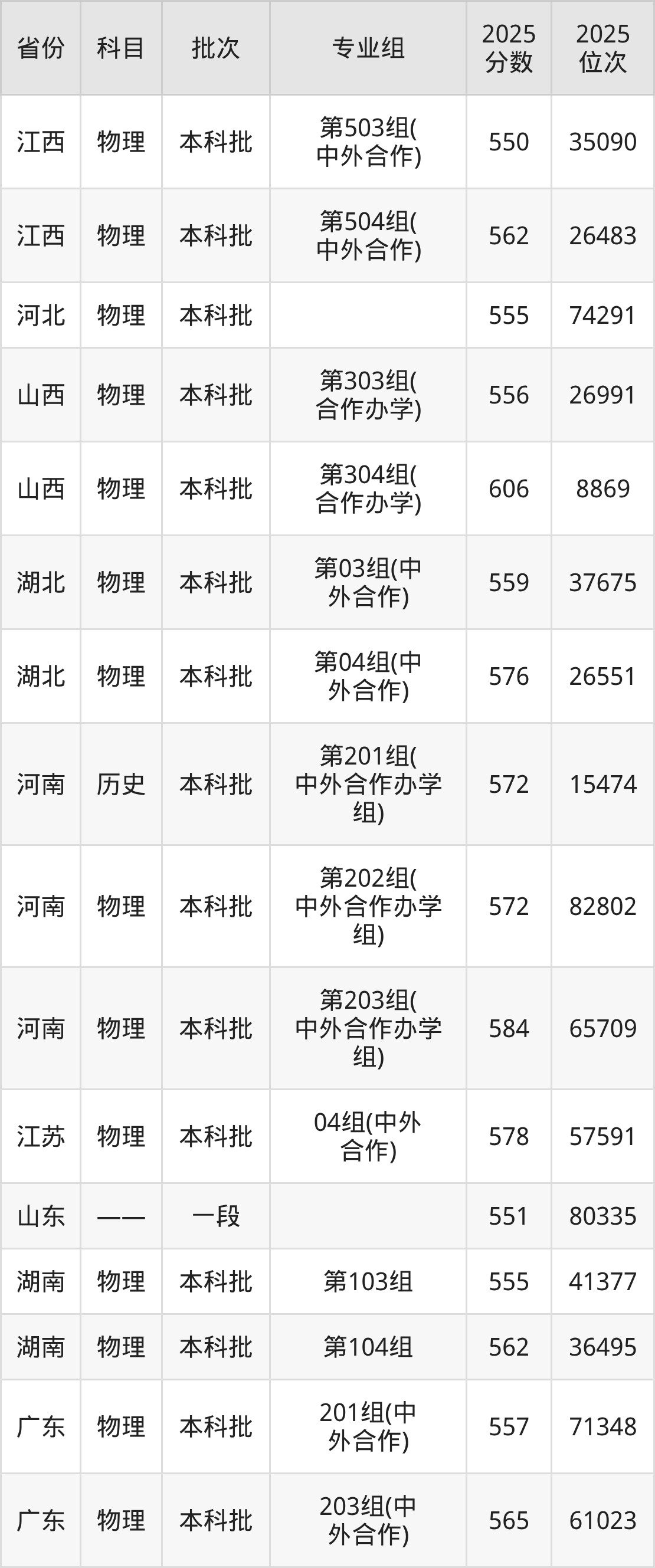 2025年在本科物理类进行招生,各专业组分数线详情如下: