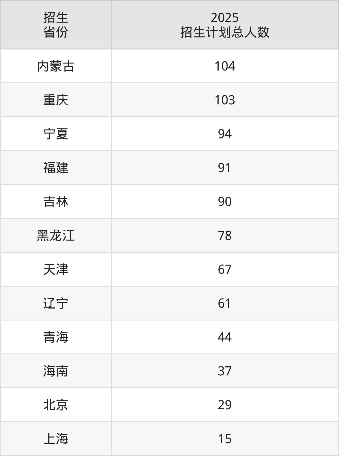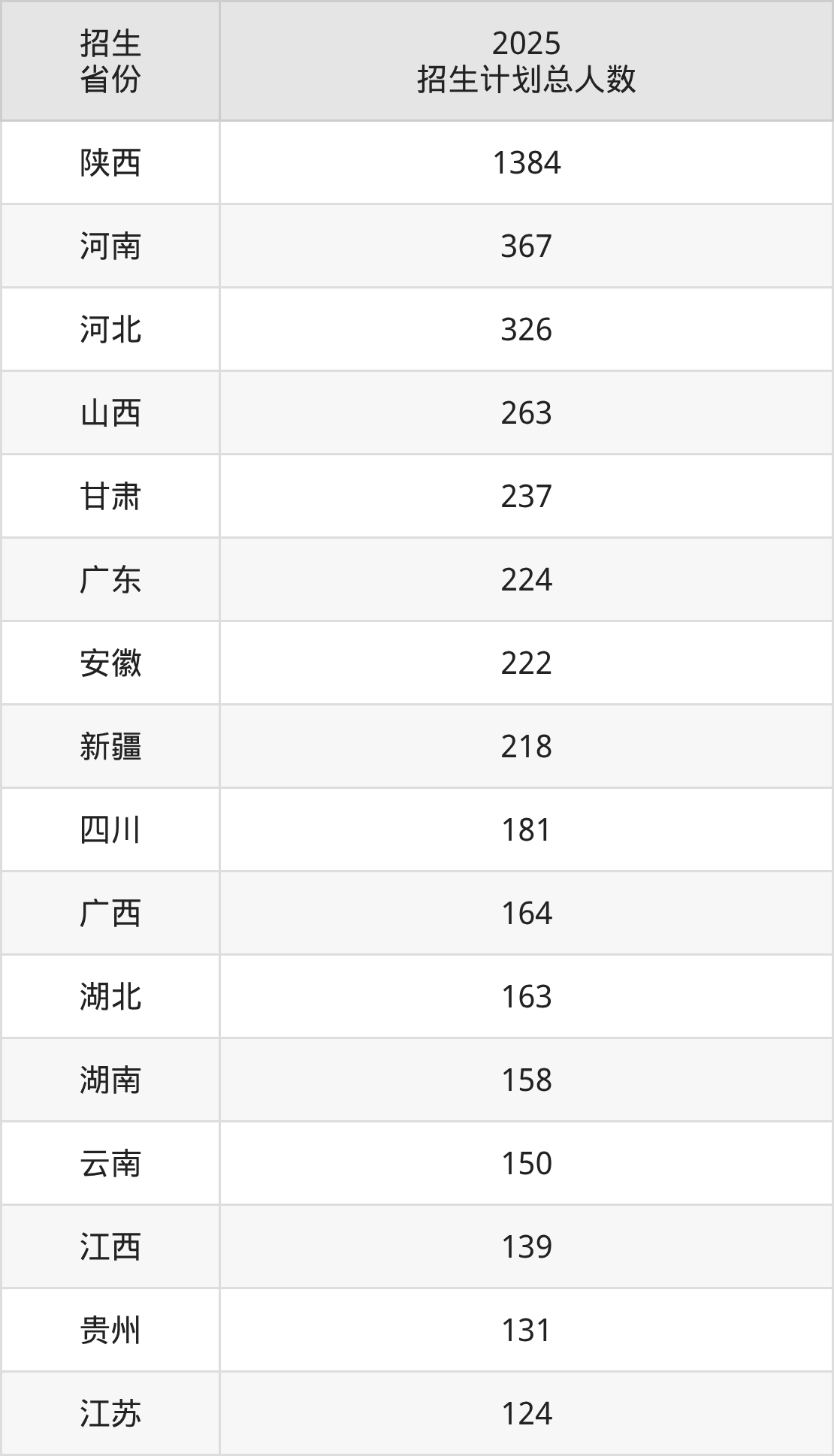 2025年长安大学面向全国28个省市开展本科招生;招生专业共52个,招生人数共5263人。2025年在陕西省招生计划总人数是1384人,其中,长安大学在陕西省招生人数最多的是机械类。长安大学在各省具体招生人数情况如下表。
