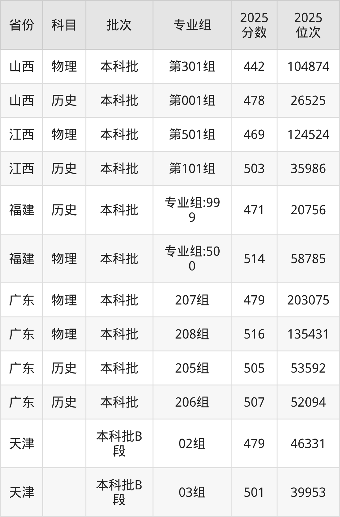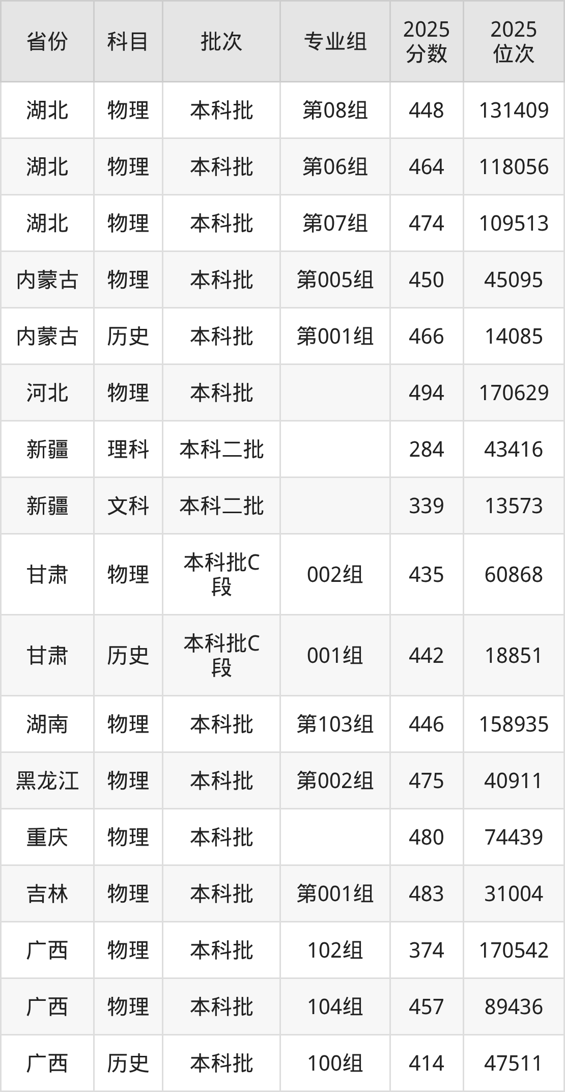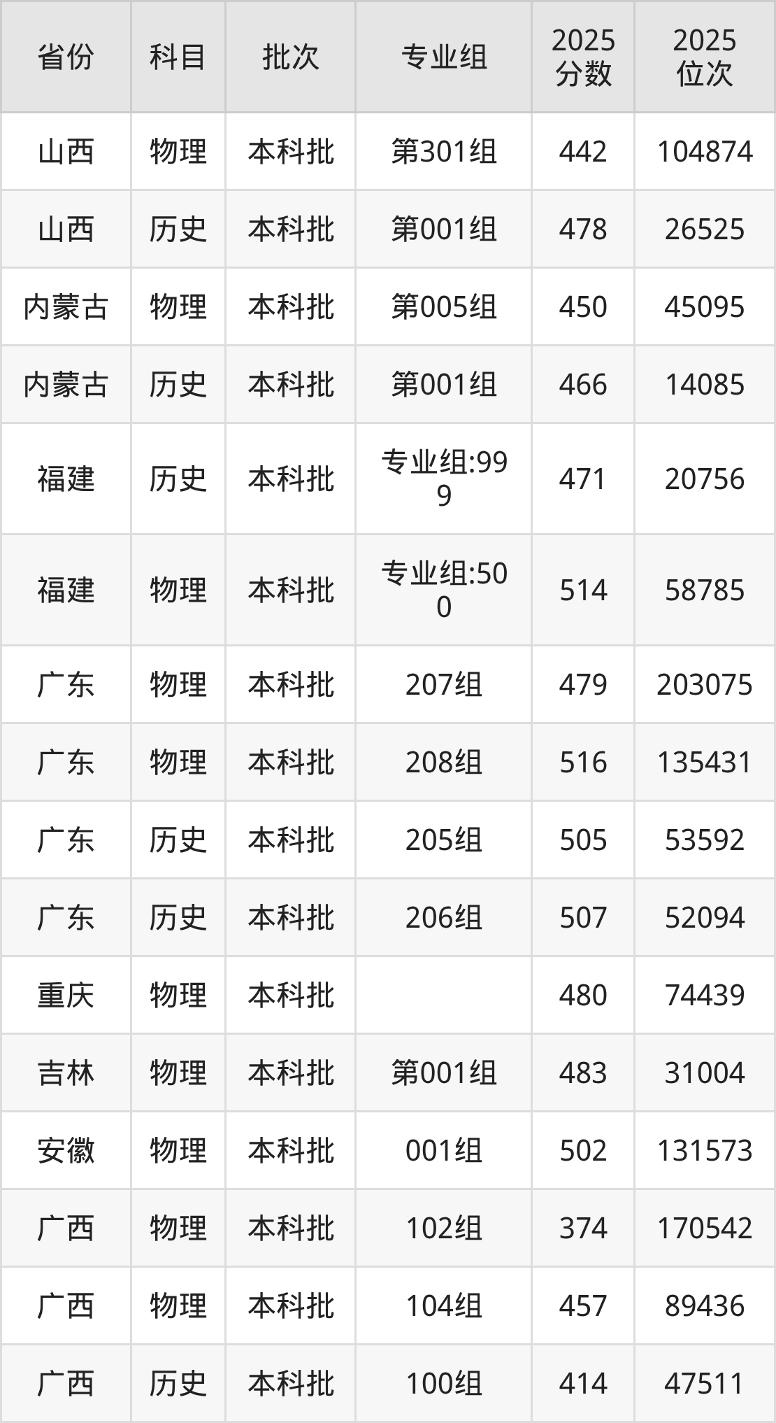2025年在本科物理类进行招生,各专业组分数线详情如下: